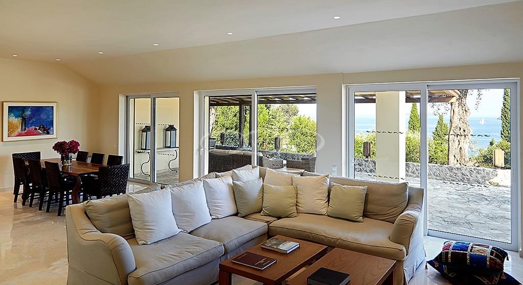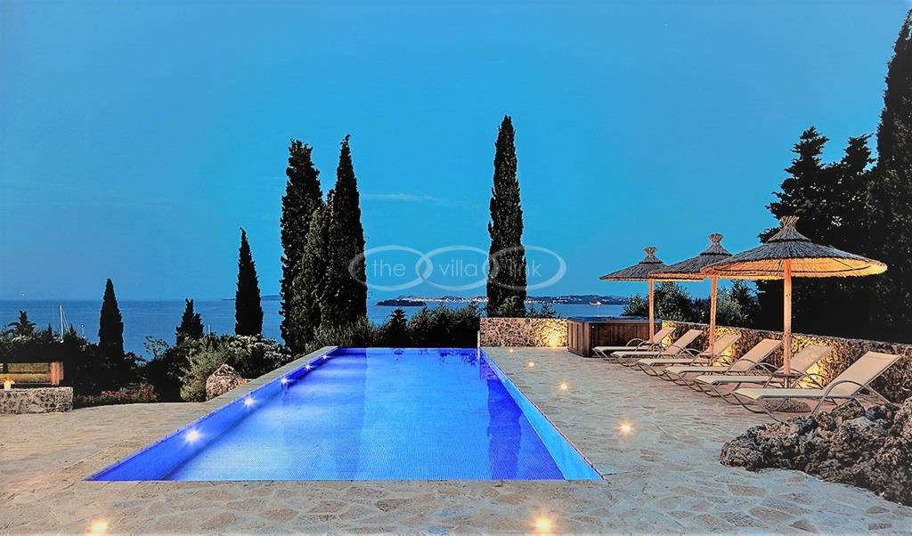 In the area of Kommeno, within walking distance to the beach and few minutes’ drive to the village and marina of Gouvio, this contemporary villa with panoramic sea views and infinity swimming pool welcomes comfortably up to 12 guests. On 3 levels, it is composed, on the main level, of a saloon opening onto the pool, a large independent fully equipped kitchen, the master bedroom with en-suite bathroom, and two double or twin bedrooms each with en-suite bathroom. A double or twin bedroom with bathroom is set on the upper level while 2 other double or twin bedrooms with en-suite bathroom are set on the garden level as well as a spa area with gym, and hammam. Air-conditioning throughout and TV in the bedrooms; Jacuzzi next to the pool.