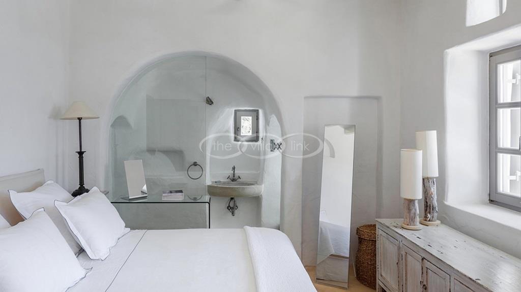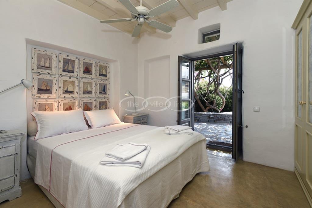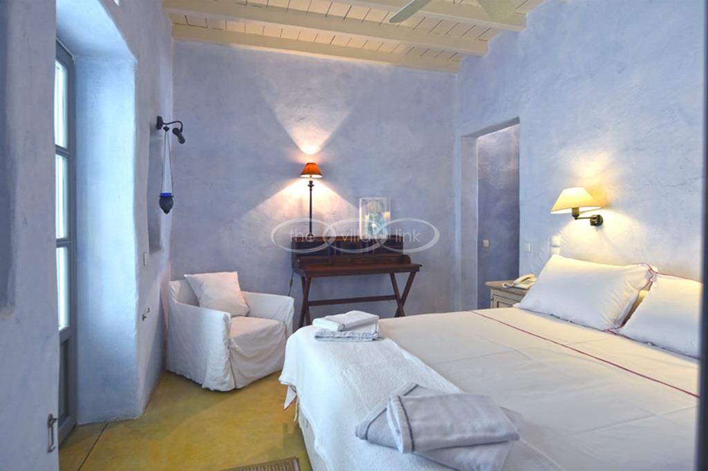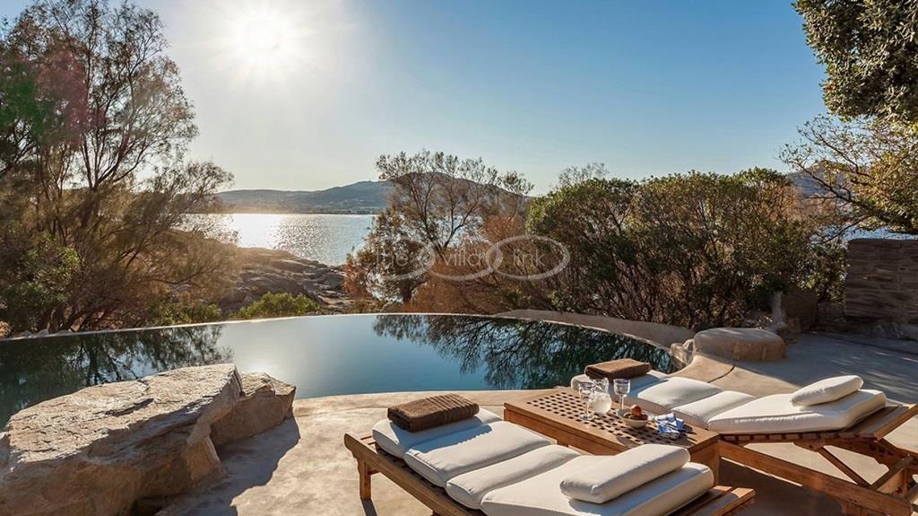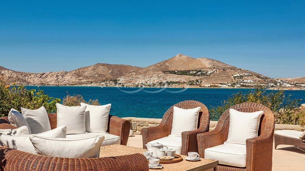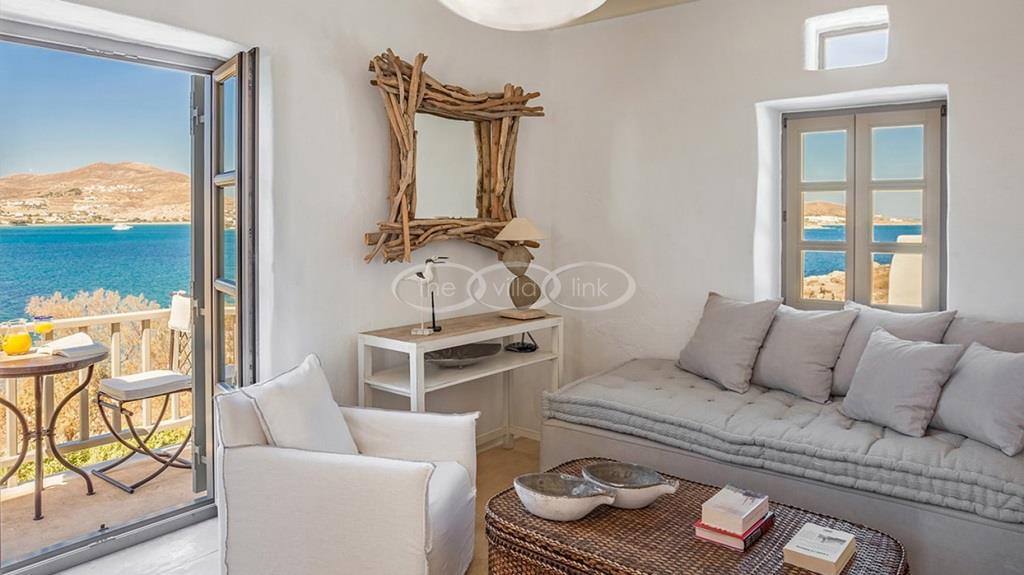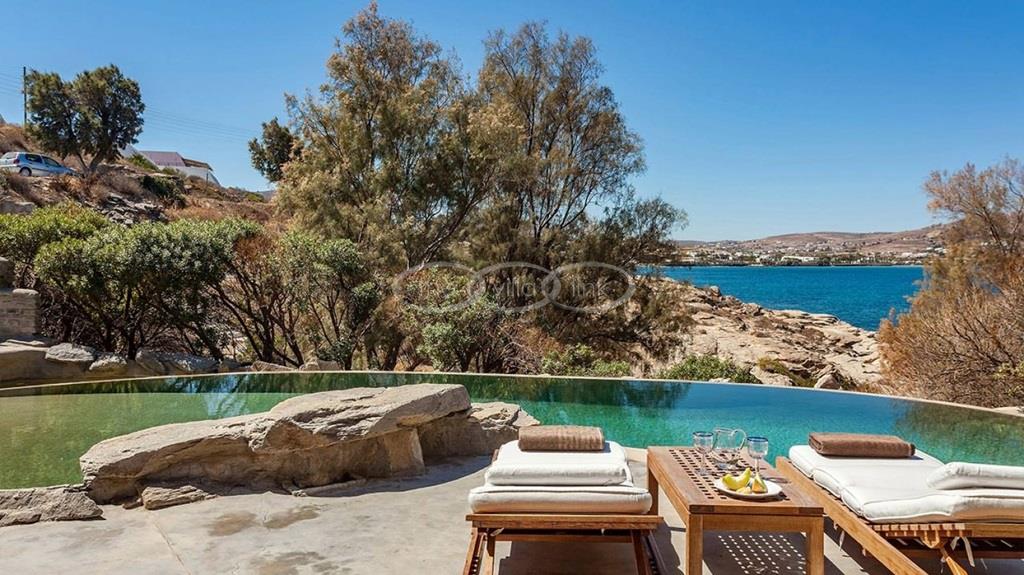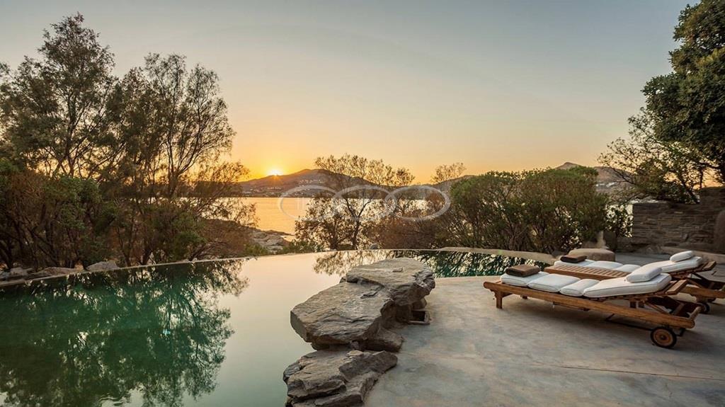 With 500m walking distance to the centre of Naoussa, this luxury waterfront villa with swimming pool welcomes comfortably up to 8 guests. It is composed, on the main level of a saloon, dining room and independent kitchen, opening onto a terrace overlooking the swimming pool and the sea, while a pool-house with al fresco dining area and barbecue are set at the pool level. The master bedroom and one double bedroom, each with en-suite bathroom are located on the main level, while the upper floor are arranged a saloon with kitchenette opening onto a terrace and 2 double bedrooms sharing a bathroom. Air-conditioning throughout; Live-in staff in independent amenities.