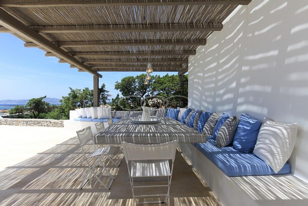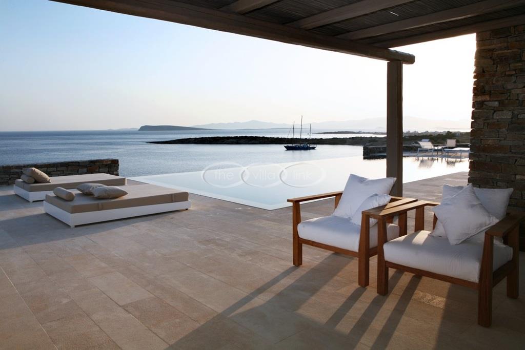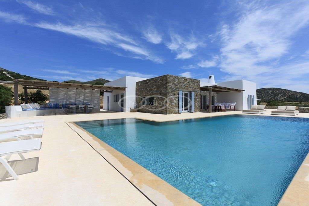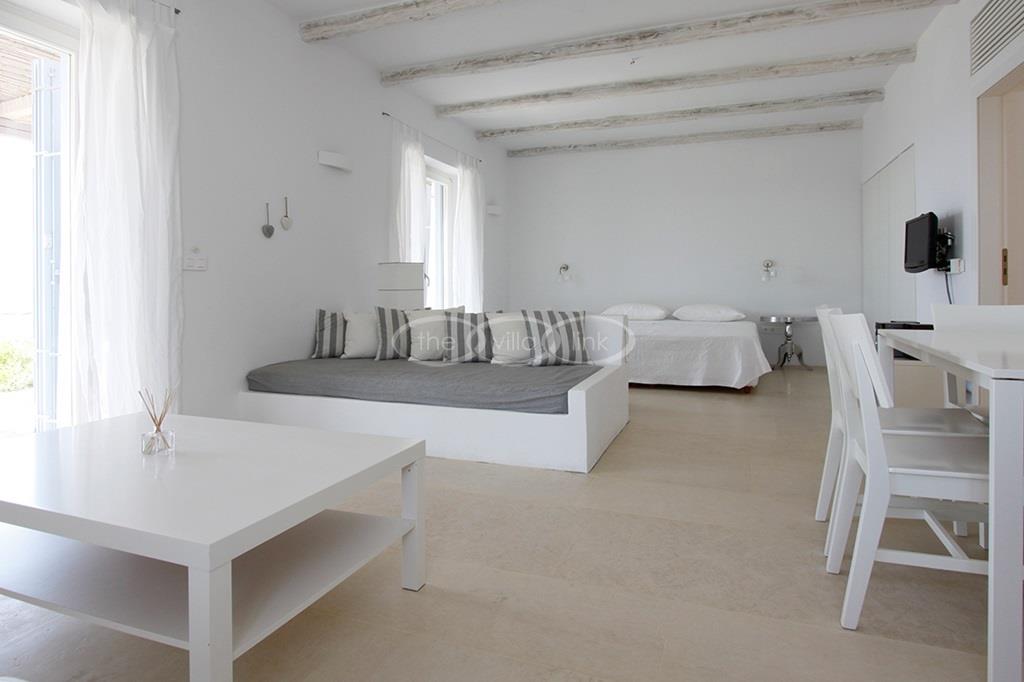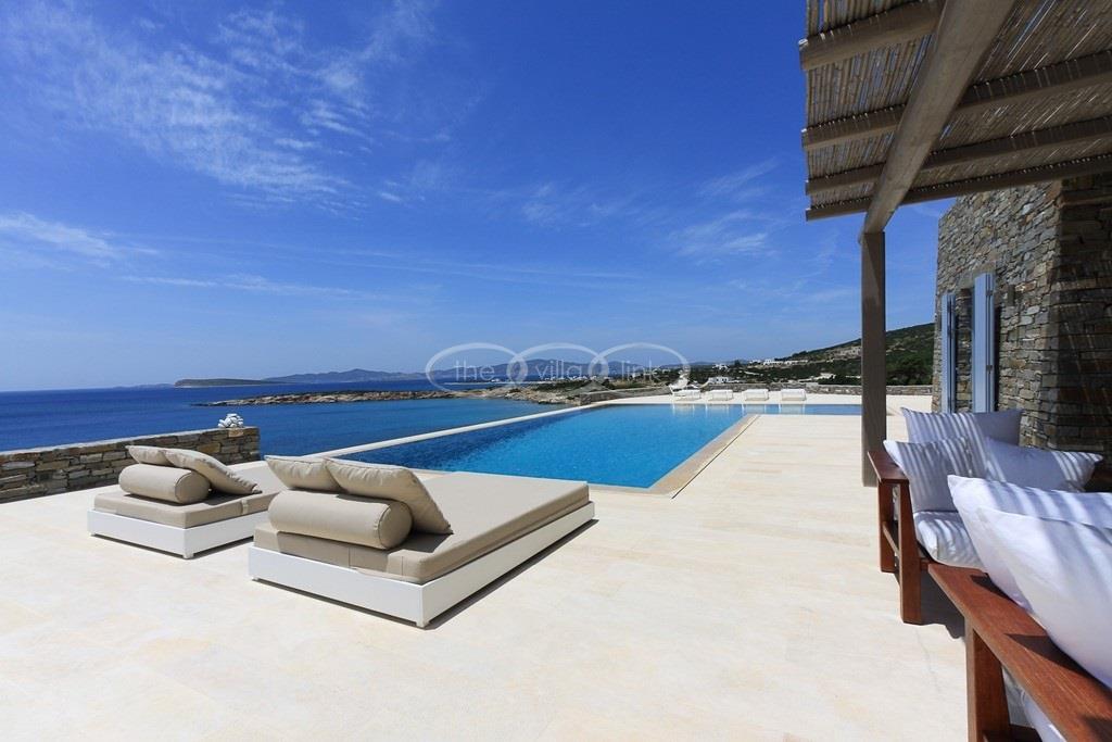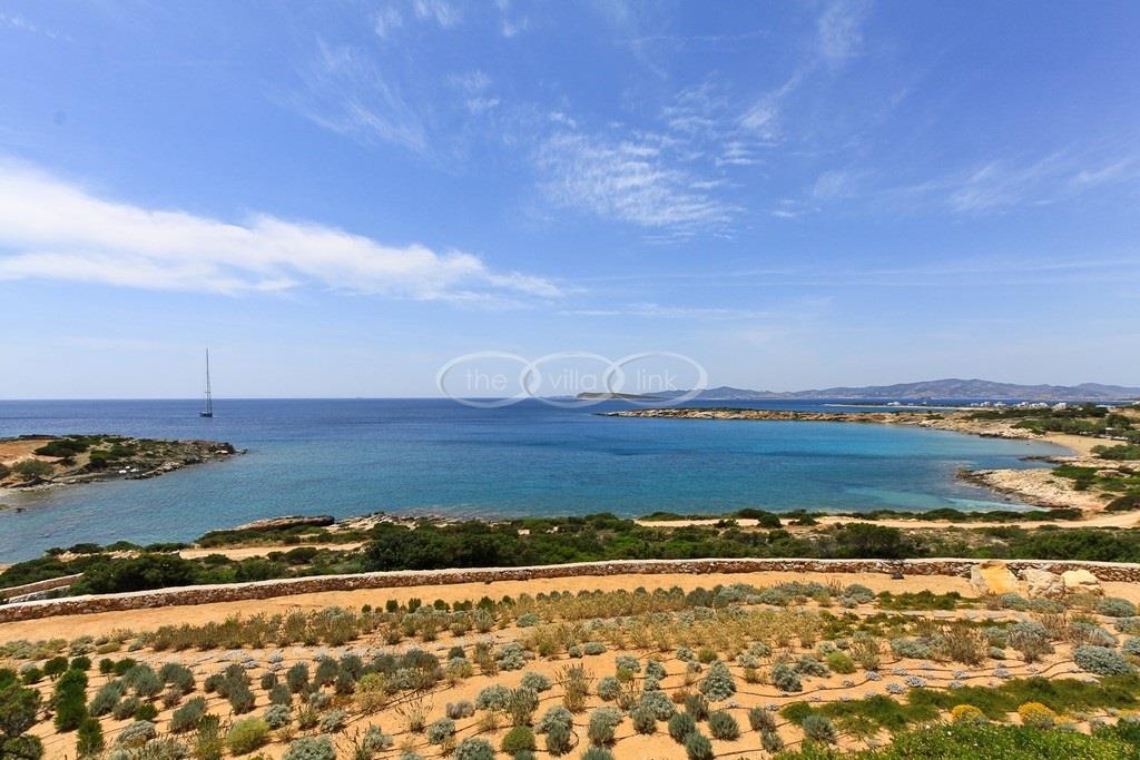 Situated on the waterfront within 150m of a sandy beach on the southern part of the island of Paros, this superb villa recently built welcomes comfortably up to 12/14 guests. Combining modernity and traditional style, the property comprise the main villa with a large living room with saloon, dining and large opened kitchen, the master suite, one double bedroom and 2 twin bedrooms, each with ensuite bathroom; 2 guests houses offer a double bedroom with bathroom for the first one and a double bedroom, a saloon with 2 sofas suitable for children and a bathroom for the other; Air-conditioning in the bedrooms; Independent staff accommodation;