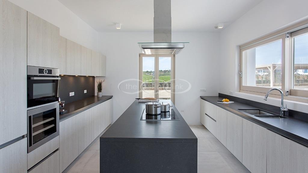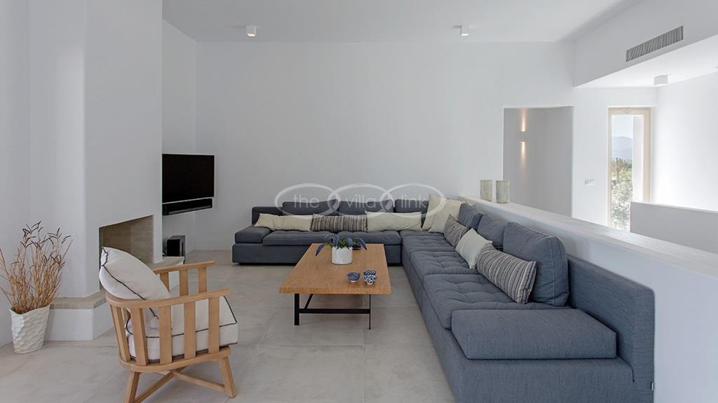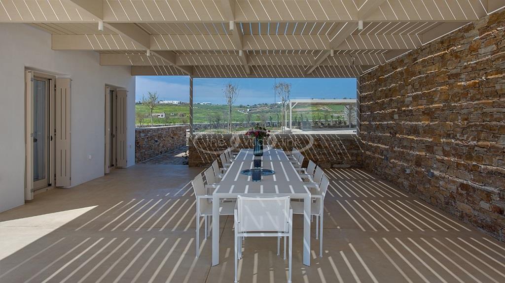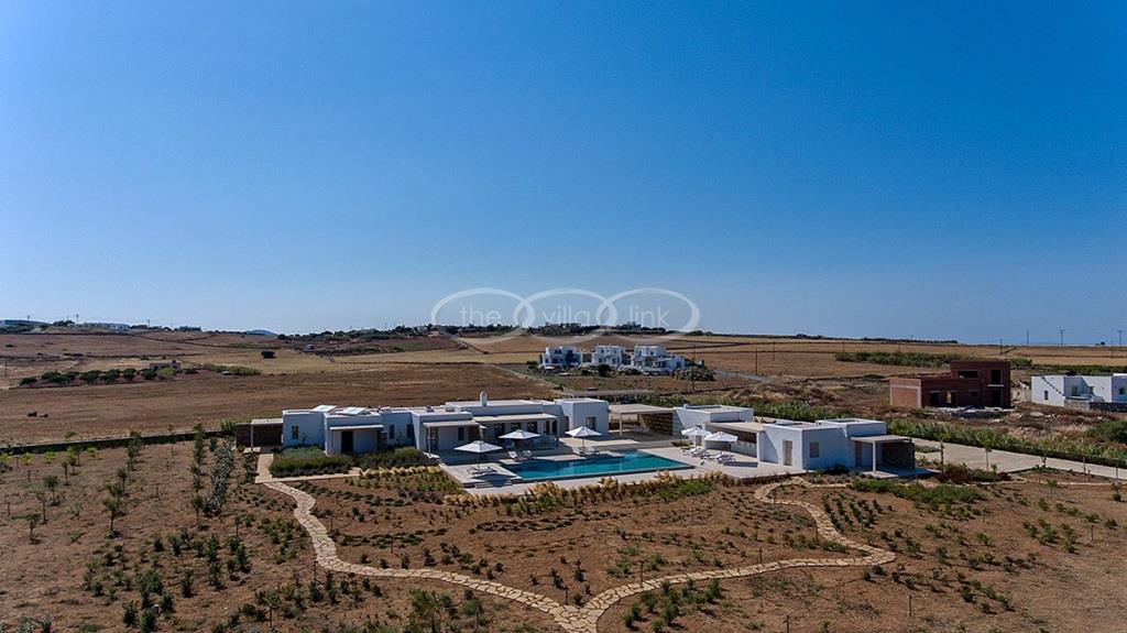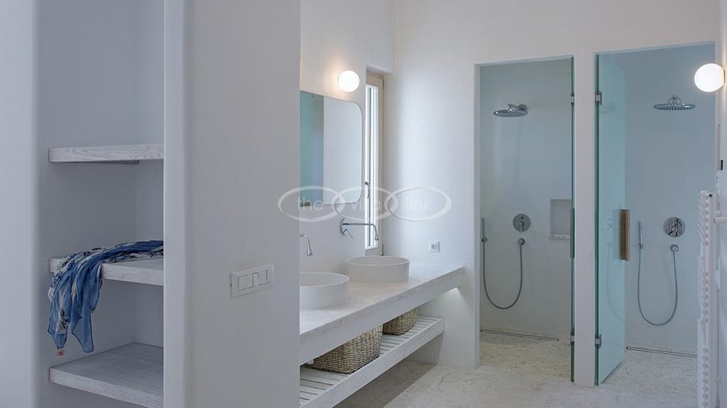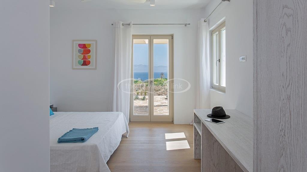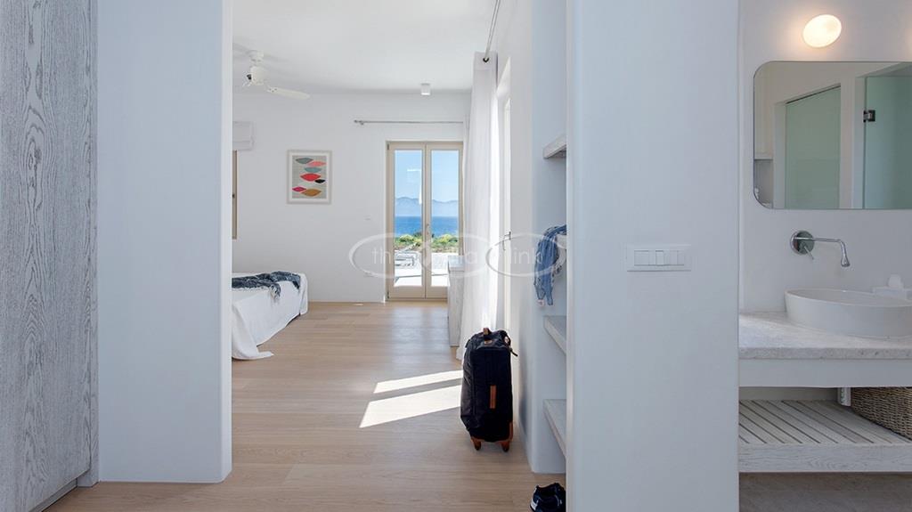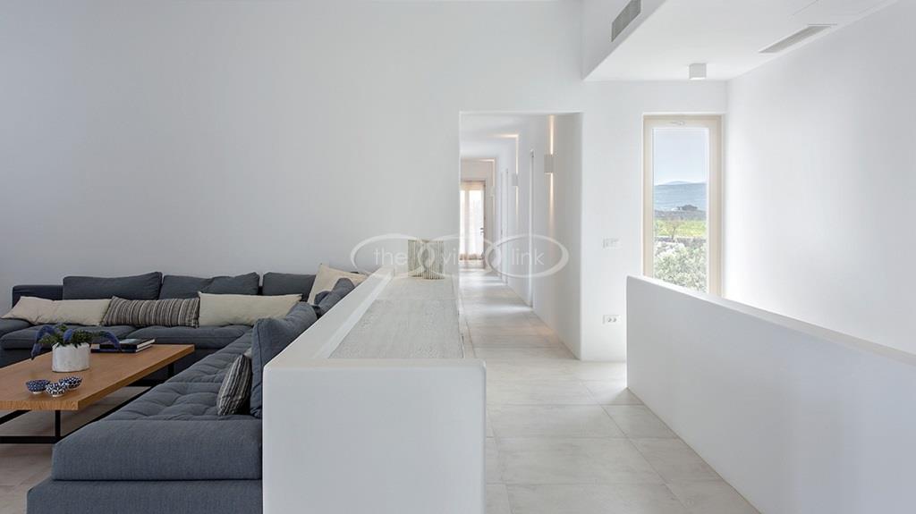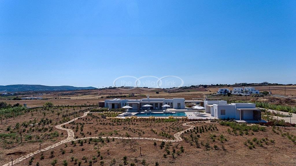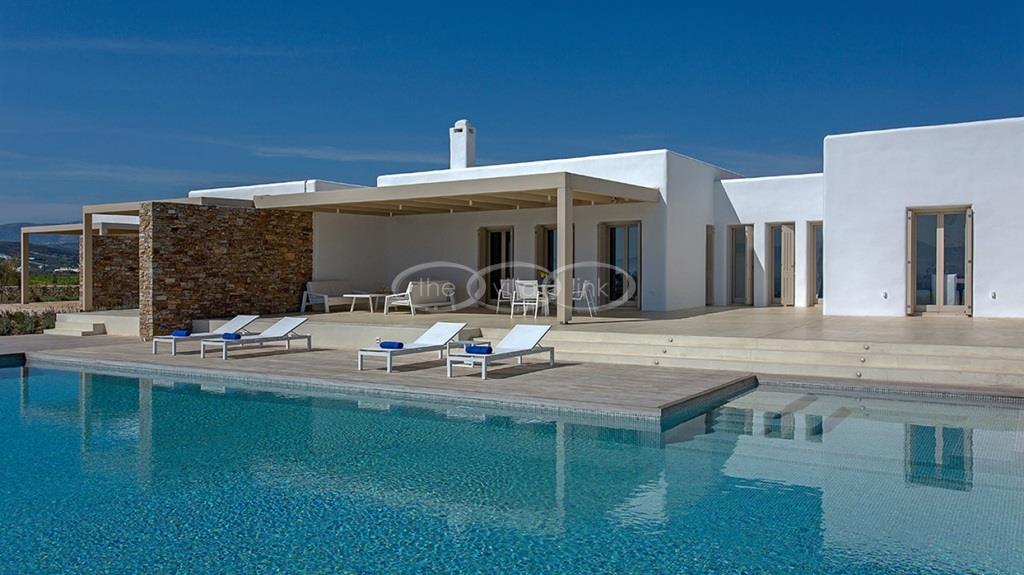 Situated on the first line on the Eastern coast of the island of Paros at the heart of a large enclosed garden, within walking distance to a small cove and a few minutes’ drive to Naoussa, this luxury and spacious contemporary villa with panoramic sea views welcomes comfortably up to 14 guests. Outside, the villa features patios and terraces with comfortable sofa beds and sunbeds, a 17x7m swimming pool, as well as magnificent outdoor dining and sitting area. With a contemporary decoration, it is composed of a main villa comprising a living room with saloon with TV and fireplace and dining area, an independent fully equipped modern kitchen, the master suite with dressing and bathroom with steam shower and 2 double bedrooms, each with en-suite bathroom with shower. On the lower level are arranged a saloon with opened kitchen, a gym, two double bedrooms with independent access and en-suite bathroom with shower and one twin bedroom with en-suite bathroom with shower that is more adapted for staff. A guest house next to the pool comprises a double or twin bedroom with bathroom. Air-conditioning throughout; Indoor-Outdoor Sonos music system; Live-in staff in independent amenities.