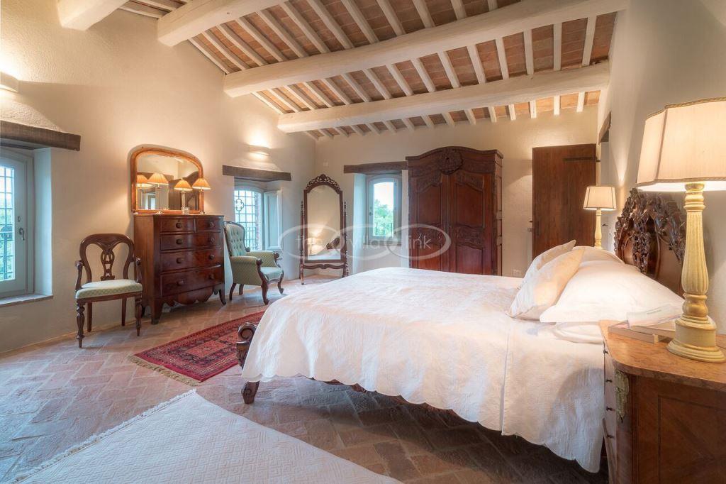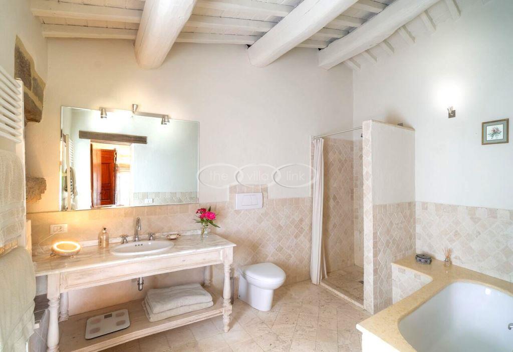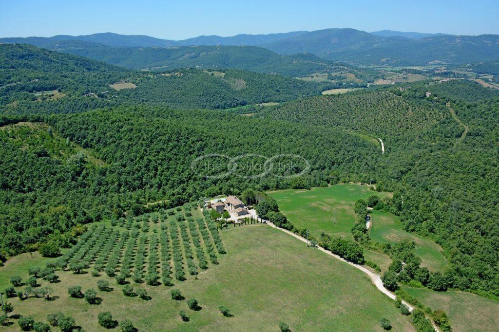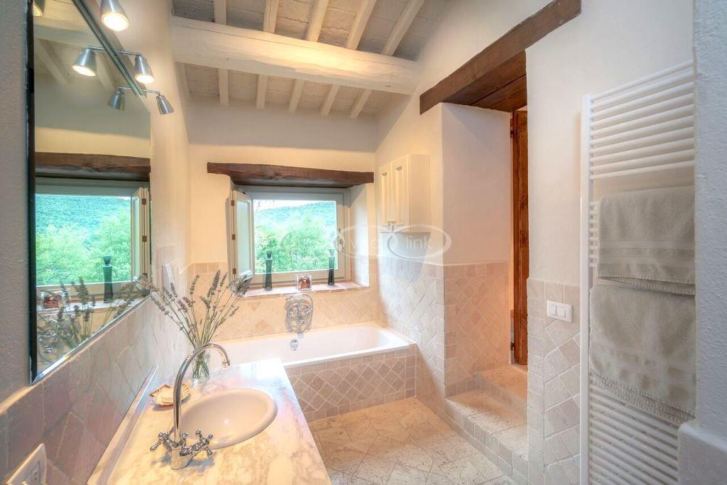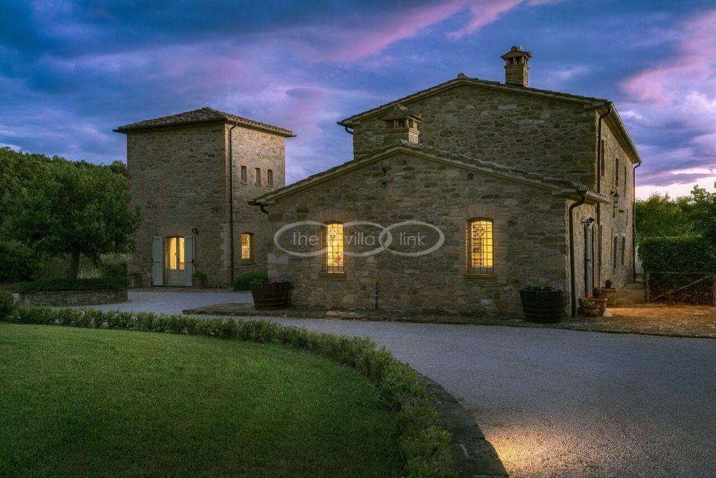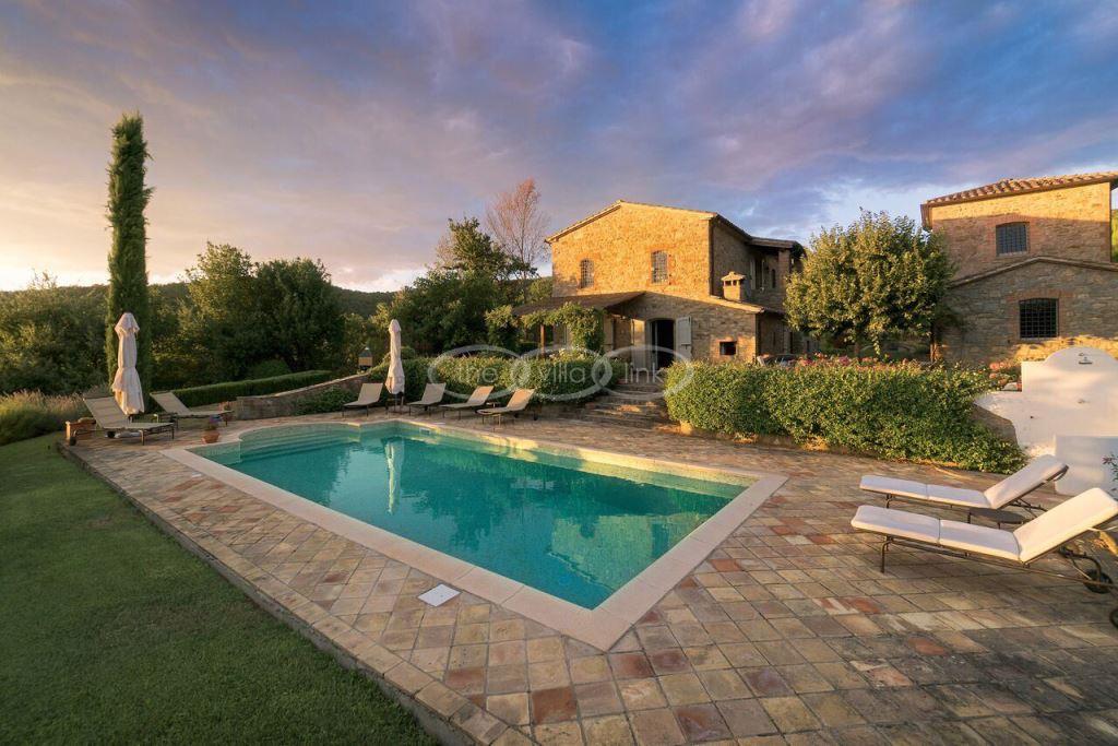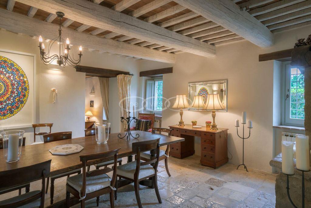 Climb the rolling hills from the Niccone valley towards the Medieval hilltop town of Preggio and arrive along a white stone road at this beautifully restored farmhouse with its equally attractive guest house. The interior of the house has been designed with emphasis on space and good proportions and flows smoothly from the kitchen through the dining room. You have two steps down to the study and on to the living room with its two large, south-west facing French doors which lead onto the terrace and pergola, with uninterrupted views across the distant Umbrian hills.