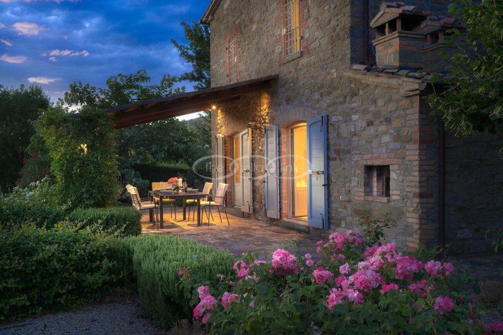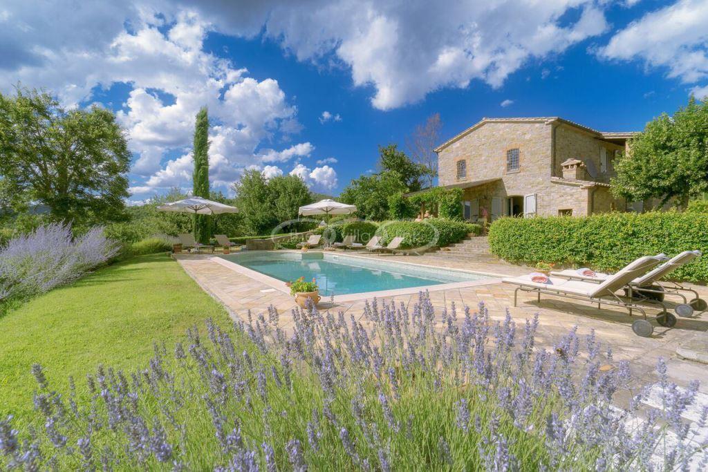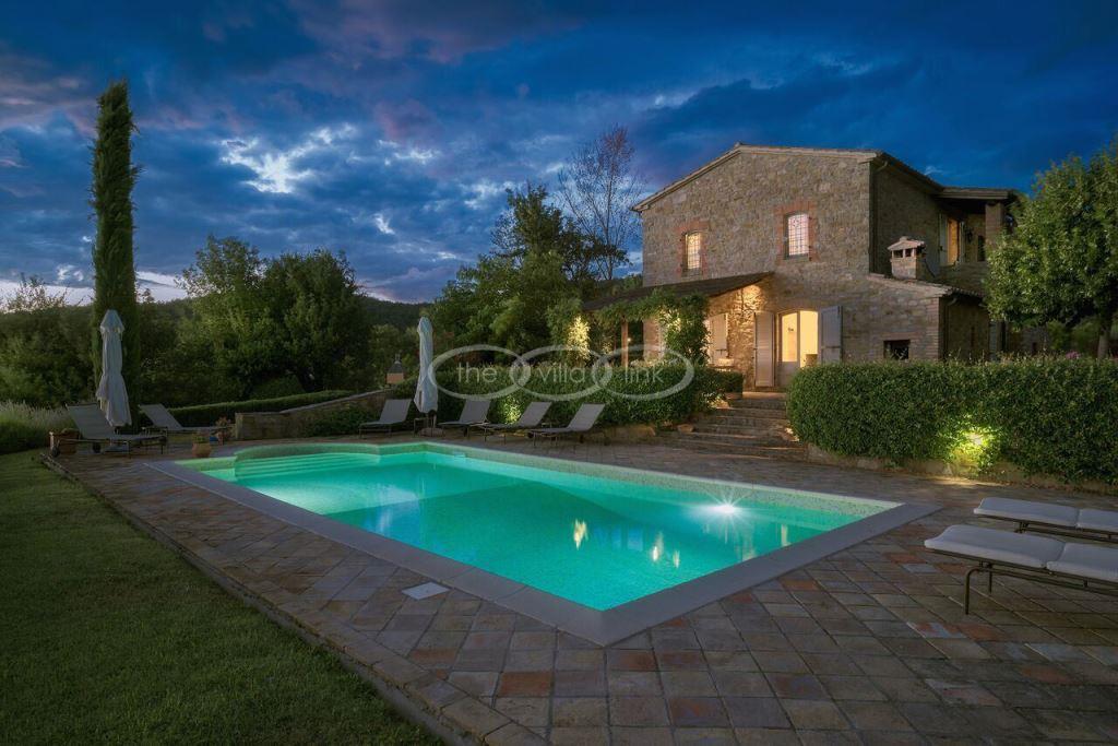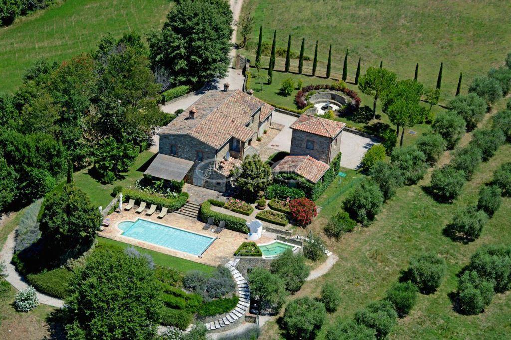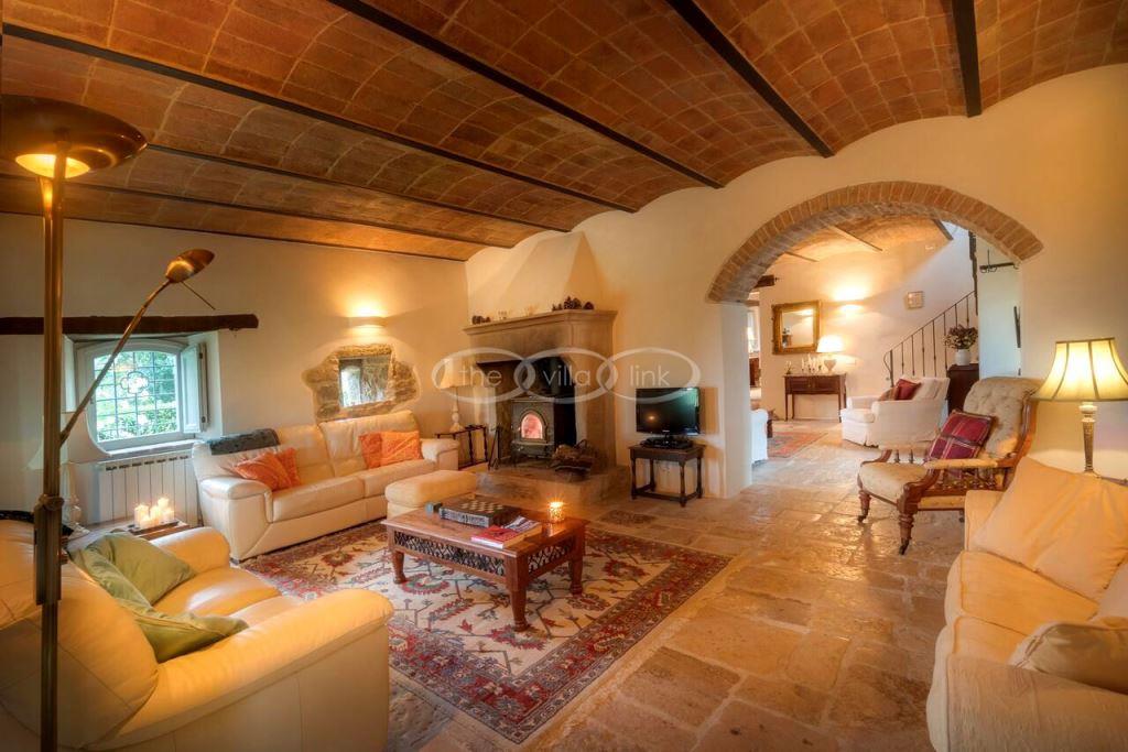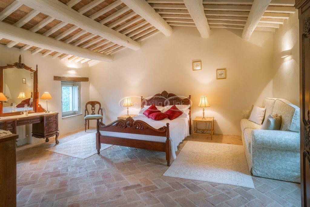 Climb the rolling hills from the Niccone valley towards the Medieval hilltop town of Preggio and arrive along a white stone road at this beautifully restored farmhouse with its equally attractive guest house. The interior of the house has been designed with emphasis on space and good proportions and flows smoothly from the kitchen through the dining room. You have two steps down to the study and on to the living room with its two large, south-west facing French doors which lead onto the terrace and pergola, with uninterrupted views across the distant Umbrian hills.