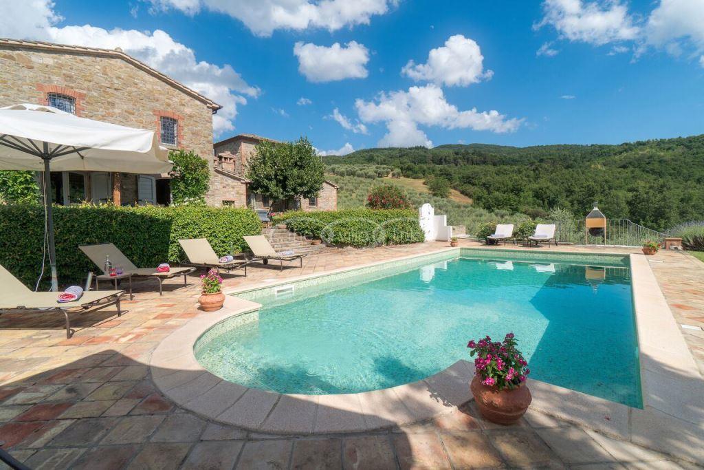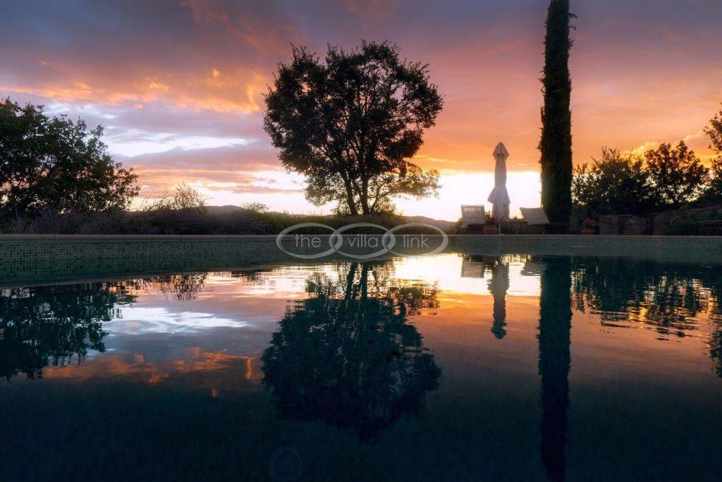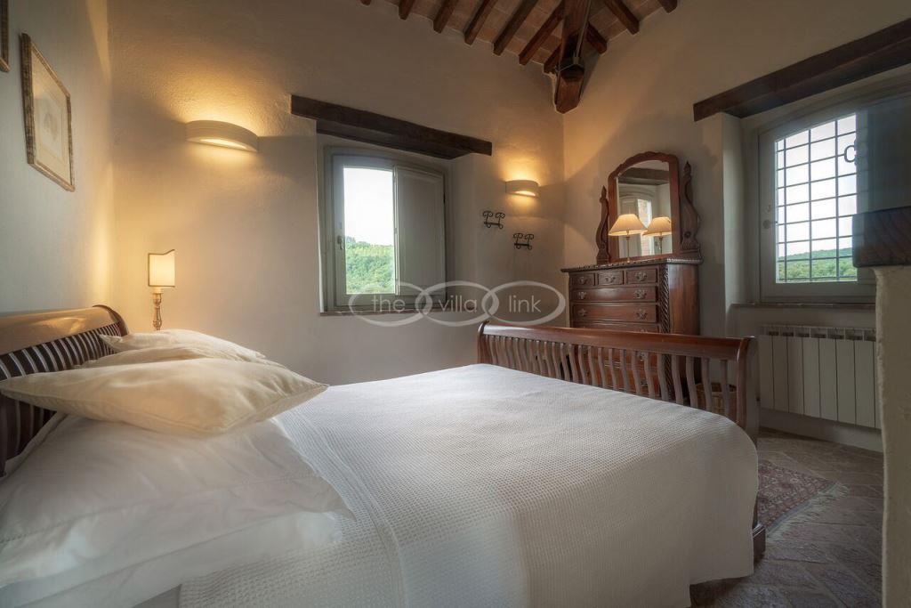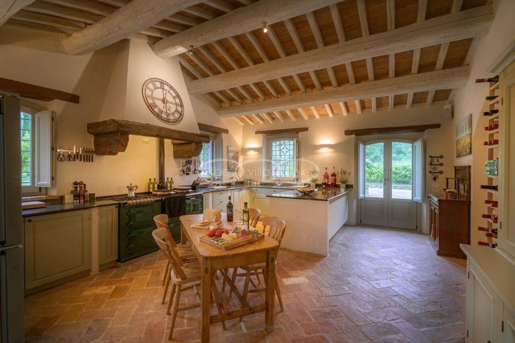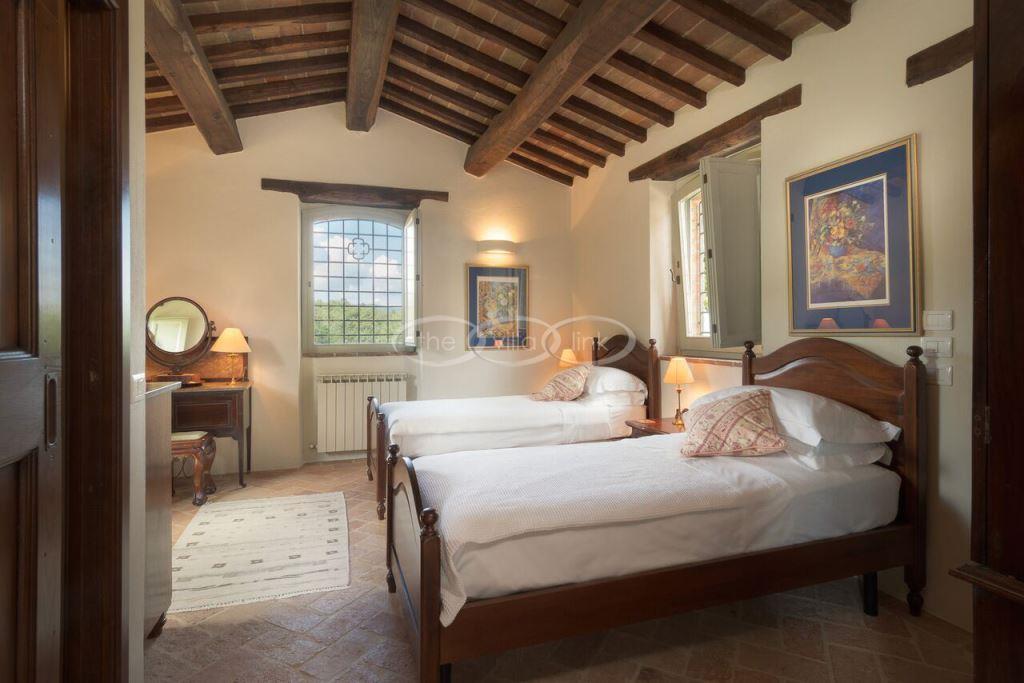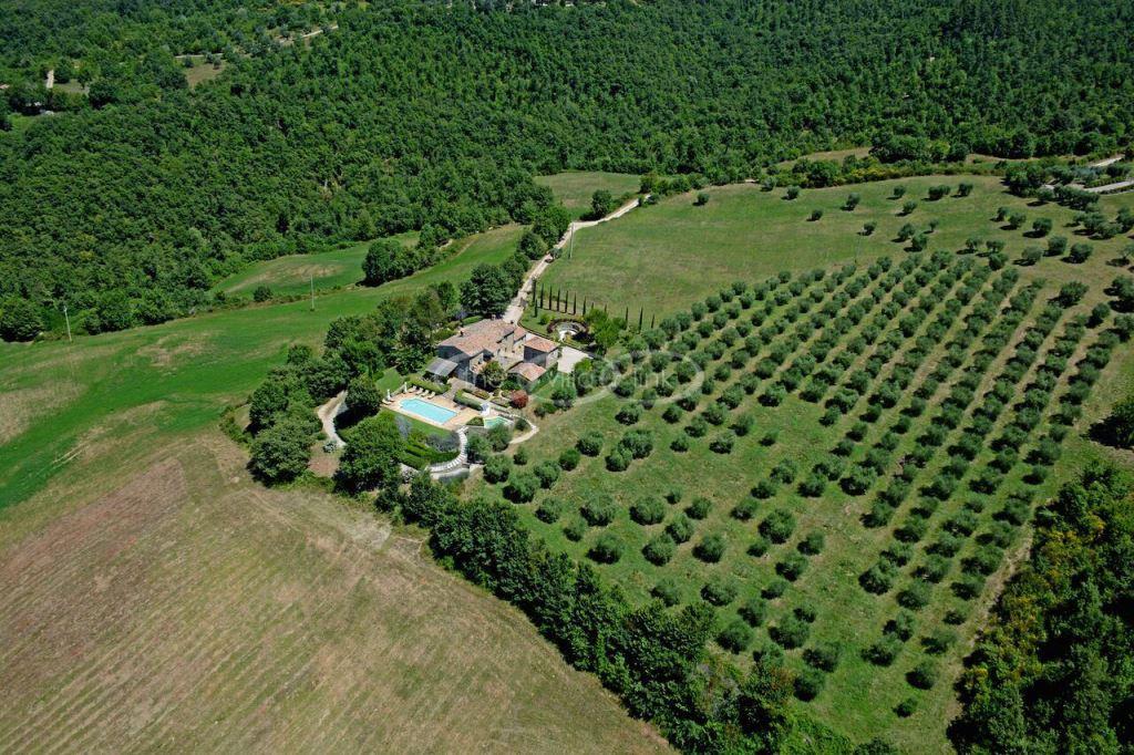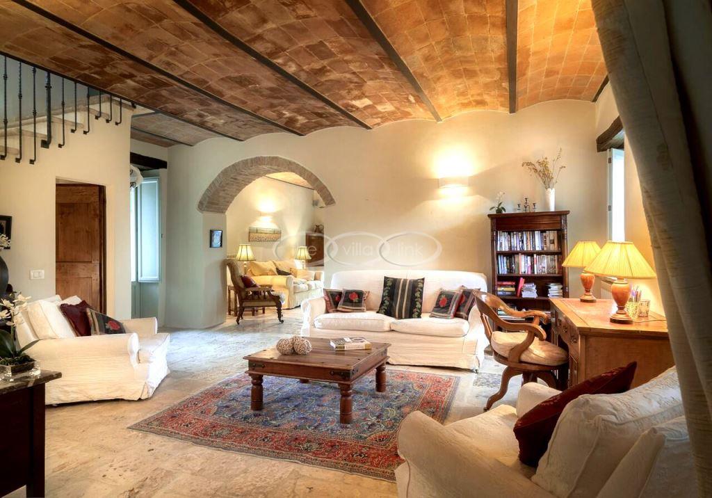 Climb the rolling hills from the Niccone valley towards the Medieval hilltop town of Preggio and arrive along a white stone road at this beautifully restored farmhouse with its equally attractive guest house. The interior of the house has been designed with emphasis on space and good proportions and flows smoothly from the kitchen through the dining room. You have two steps down to the study and on to the living room with its two large, south-west facing French doors which lead onto the terrace and pergola, with uninterrupted views across the distant Umbrian hills.