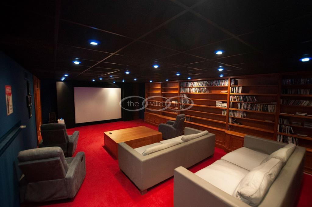 Cinema room with a 3*3 metre screen that seats 12 guests, plasma screen TVs, surround music system