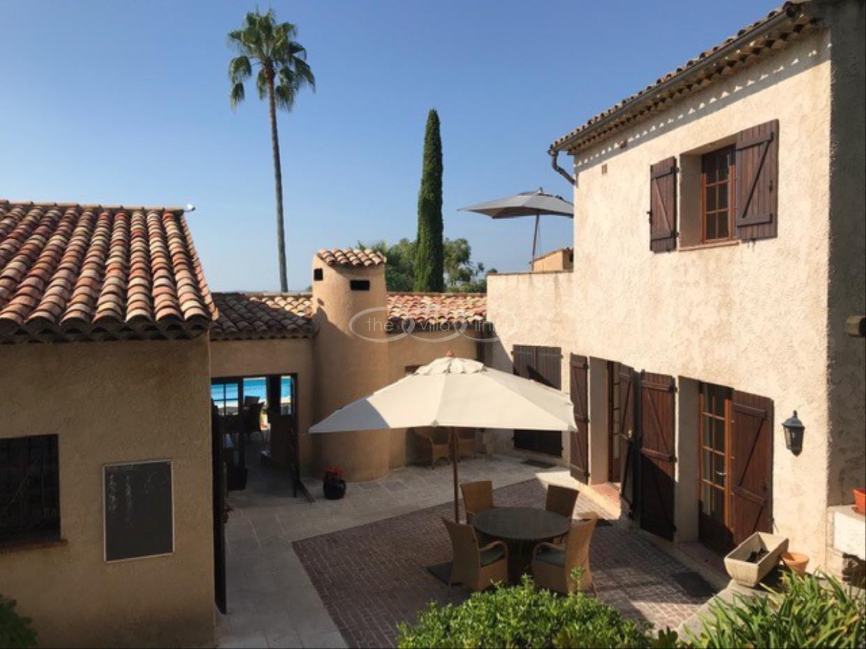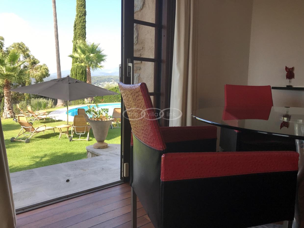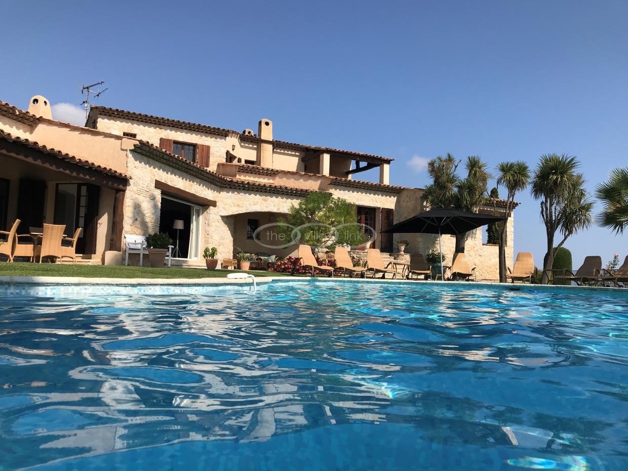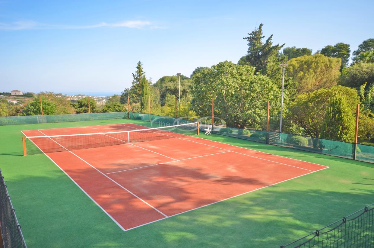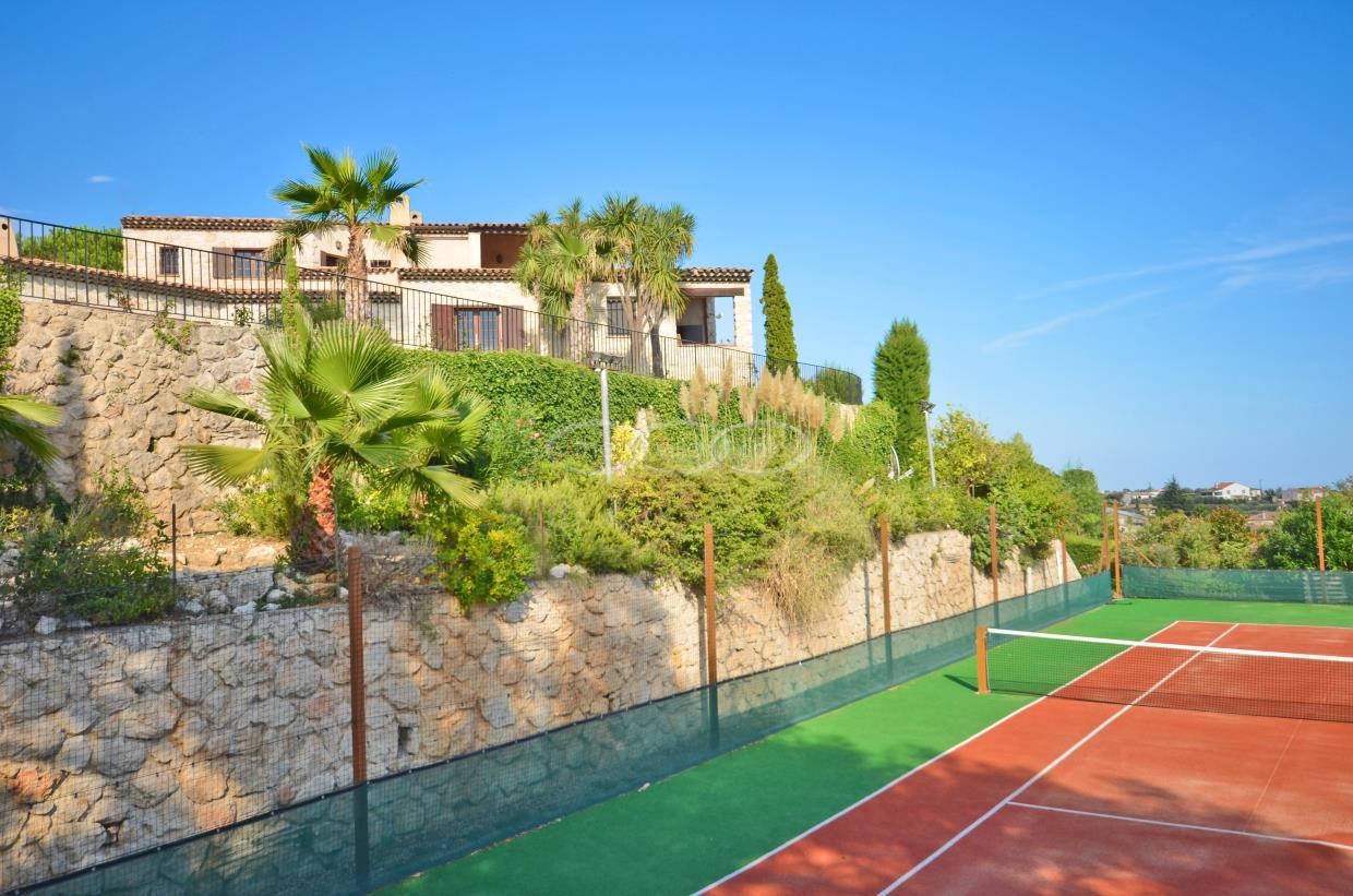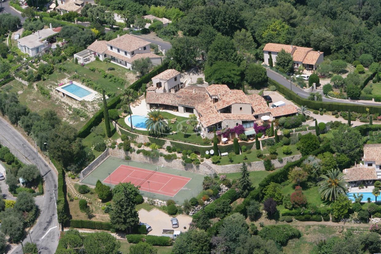 This large estate offers a relaxing haven to all guests. The min villa consists of four seperate apartments or suites (all fully equipped with kitchen and bathrooms) and four double rooms that. The annexe has another twobedrooms, living space , kitchen and bathrooms. It is the perfect get-away for several families or for your corporate events. The large salt water pool offers views down to the Mediterranean as well as the mountain range behind St Paul de Vence. You also hava afull sized and private tennis court (where a helicopter can land).