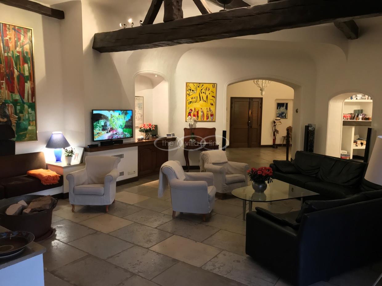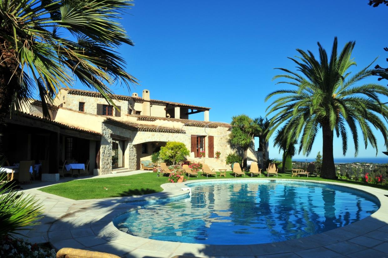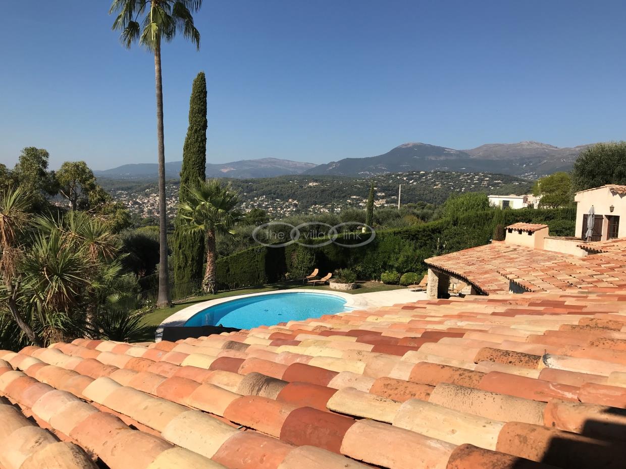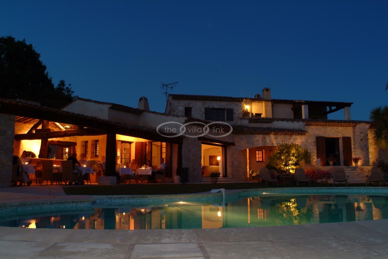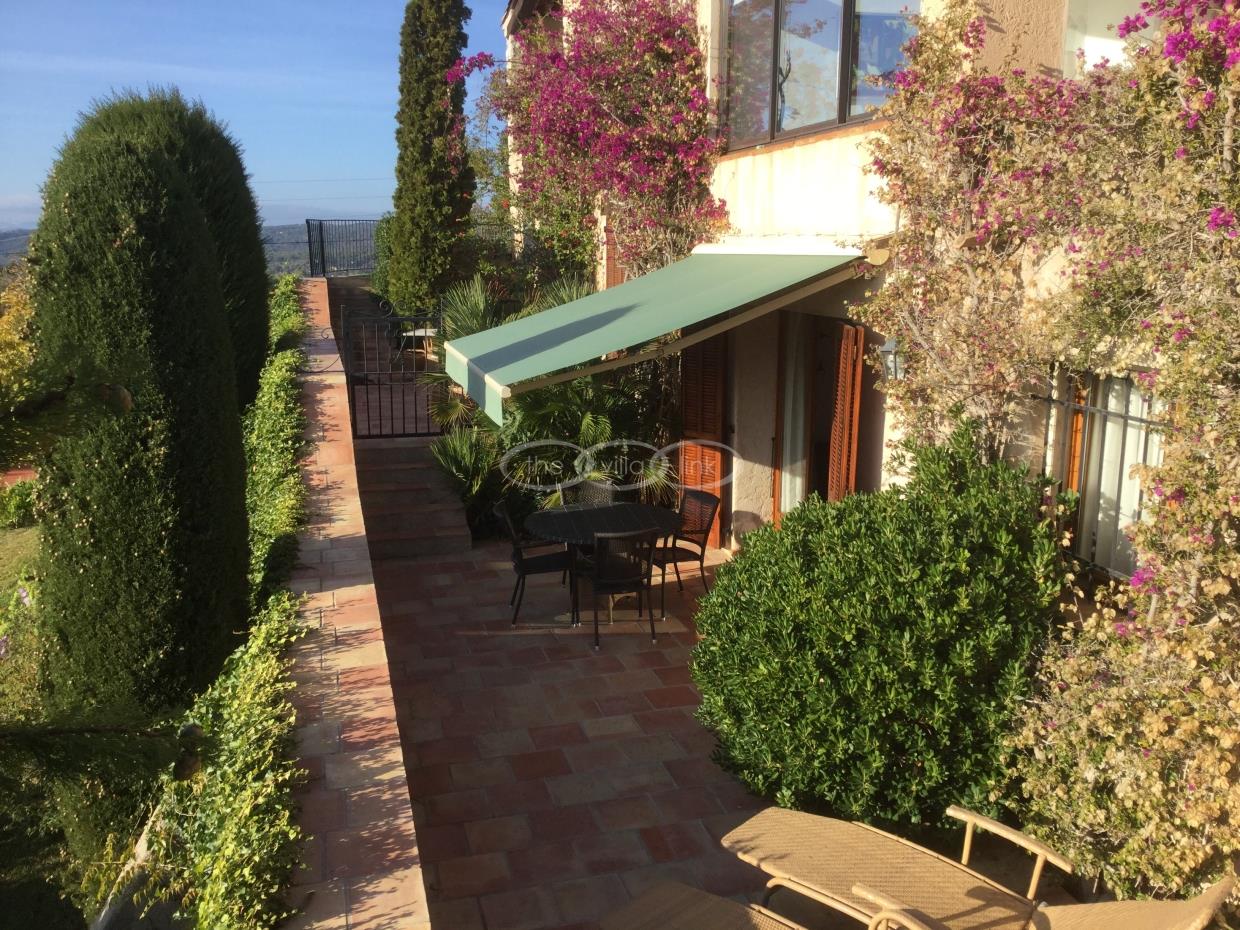 This large estate offers a relaxing haven to all guests. The min villa consists of four seperate apartments or suites (all fully equipped with kitchen and bathrooms) and four double rooms that. The annexe has another twobedrooms, living space , kitchen and bathrooms. It is the perfect get-away for several families or for your corporate events. The large salt water pool offers views down to the Mediterranean as well as the mountain range behind St Paul de Vence. You also hava afull sized and private tennis court (where a helicopter can land).