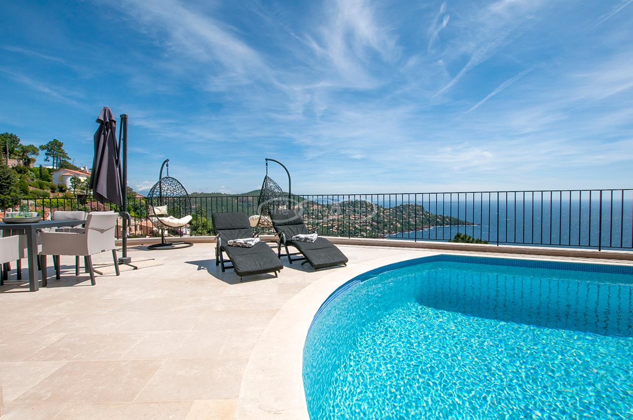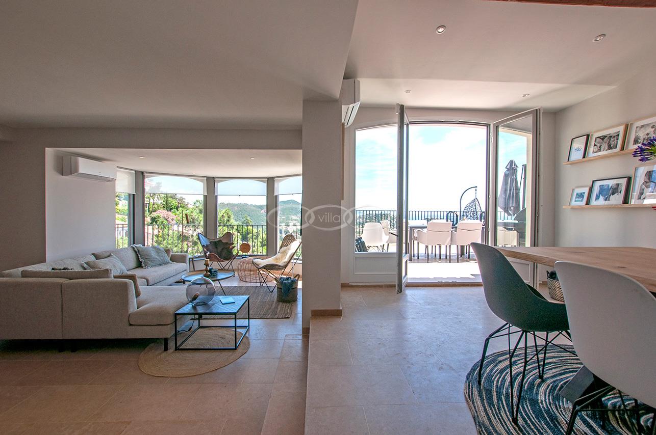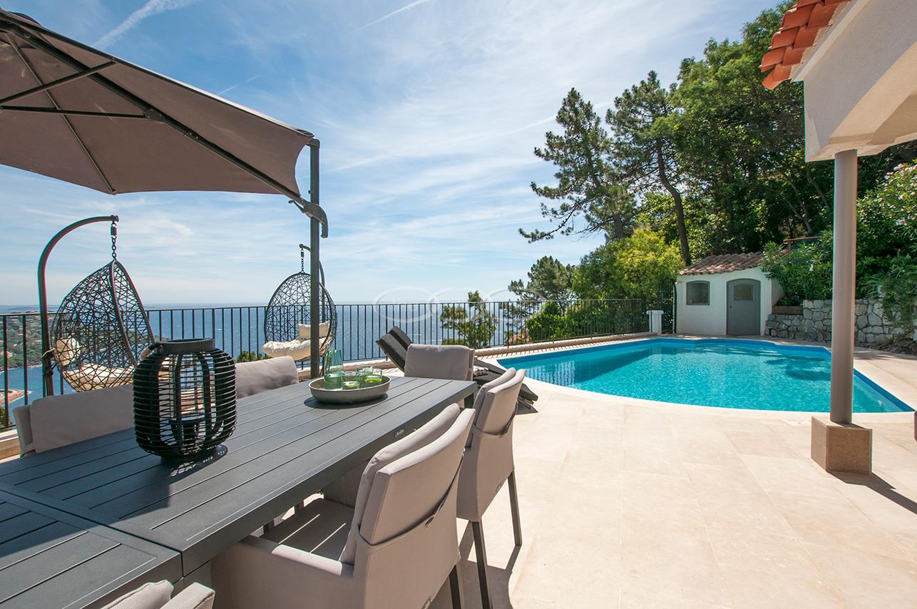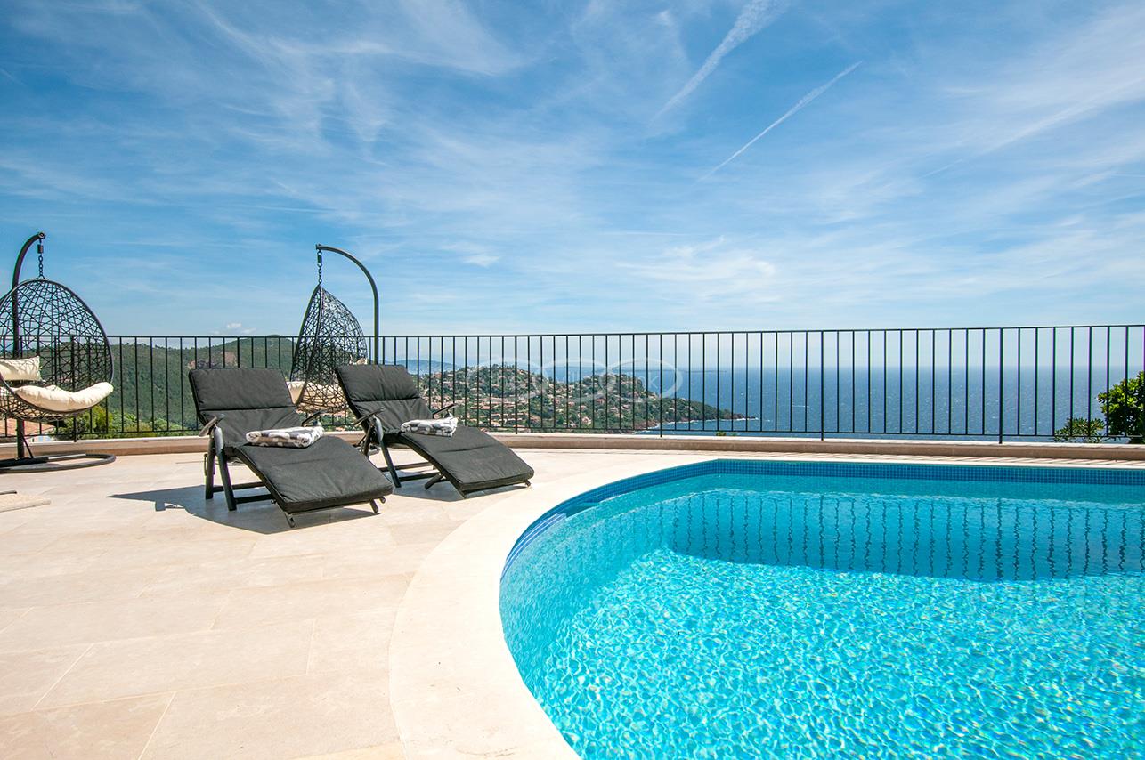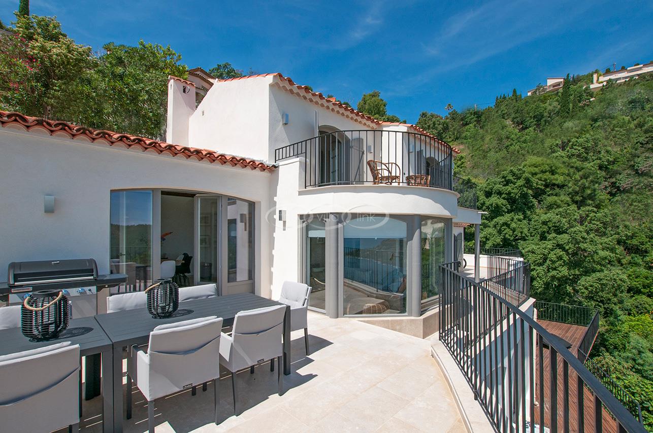 This modern and newly refurbished villa offers amazing and unobtructed views over the Mediterranean. Located in a closed community, it offers a relaxing and serene holiday. There is no garden space but the three large terraces (on three levels)enables you to enjoy the fabulous sun no matter what.
