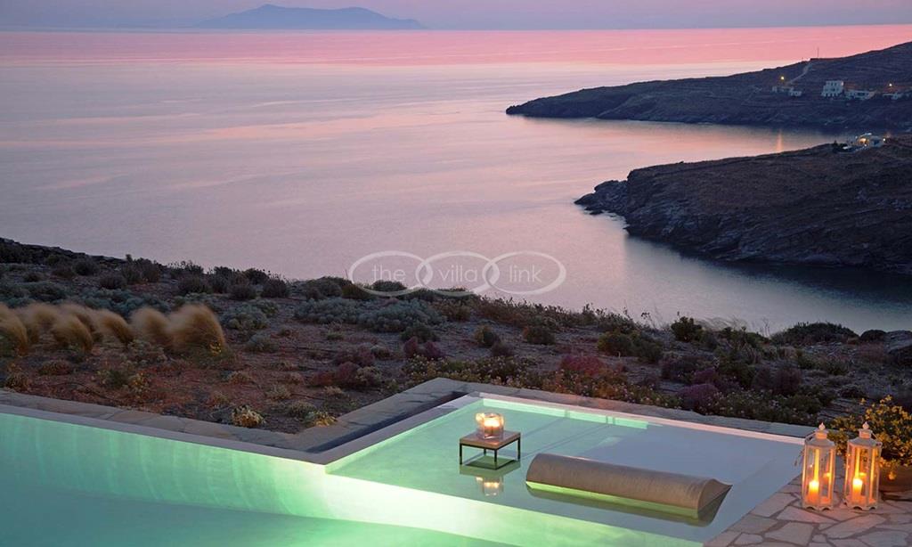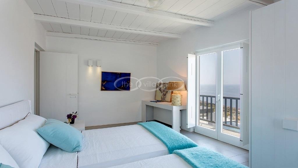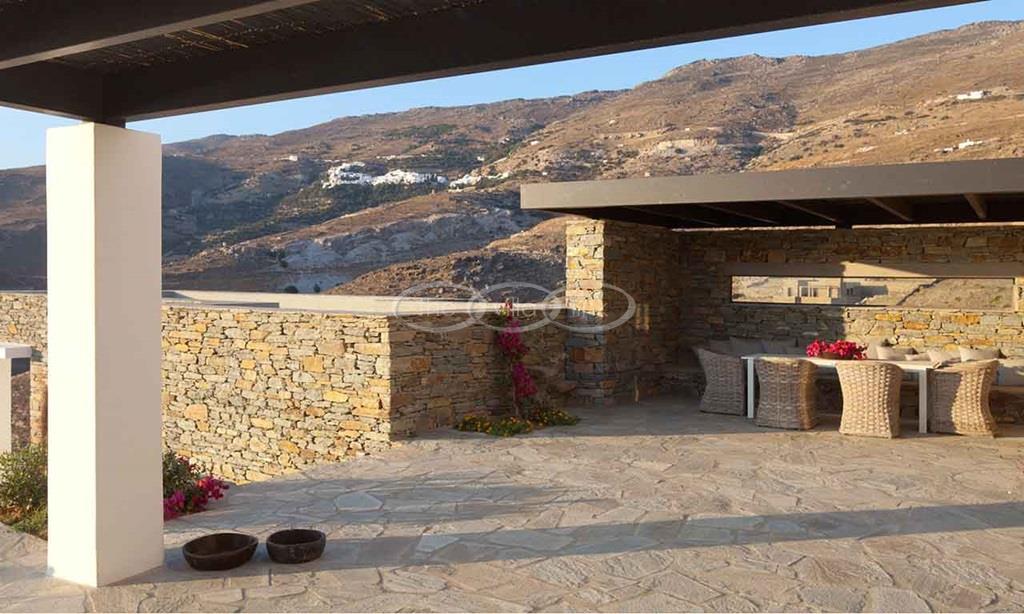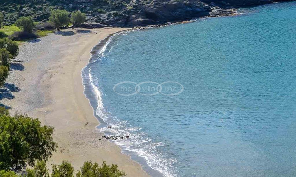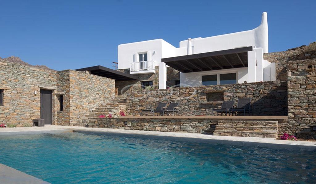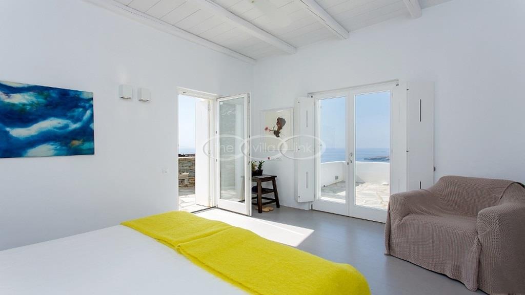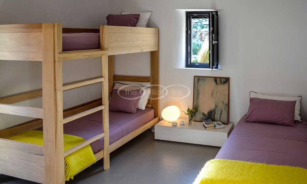 On the Southern cost of the island of Tinos, in a private domain with beach within walking distance, this seafront with swimming pool welcomes comfortably up to 11 guests. With a contemporary interior style, it is composed of a main villa with, on the main level, a living room with saloon and dining area and a fully equipped modern kitchen, and, on the upper level, the master suite with private terrace and bathroom and one twin bedroom and one bedroom with 2 bunk beds and a single bed sharing one bathroom. The guests house comprise one double and one twin bedroom sharing a bathroom ; Ceiling fans in the bedrooms; Luxury service level and personnel on demand; Rental all year long;