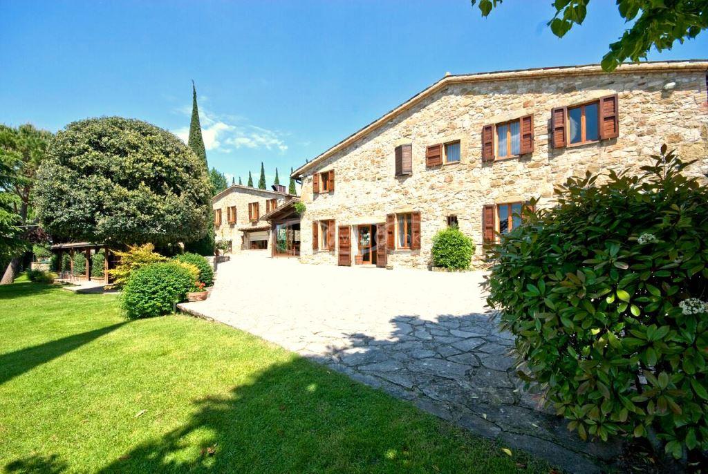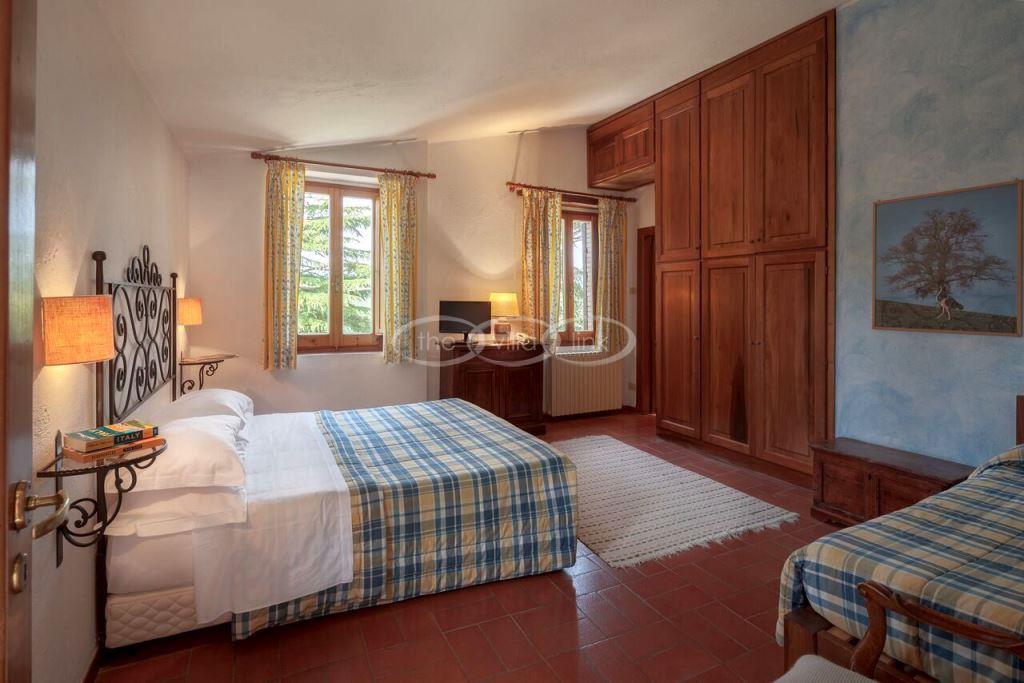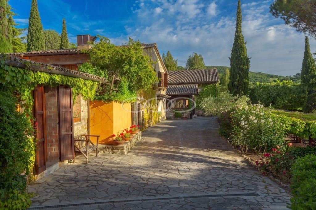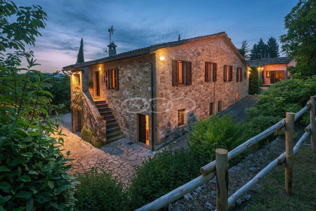 At the end of a cypress avenue protected by the woods, the ‘curtain’ of the Umbrian hills opens, a real postcard image that surrounds this villa, including its guest houses.