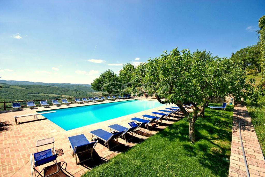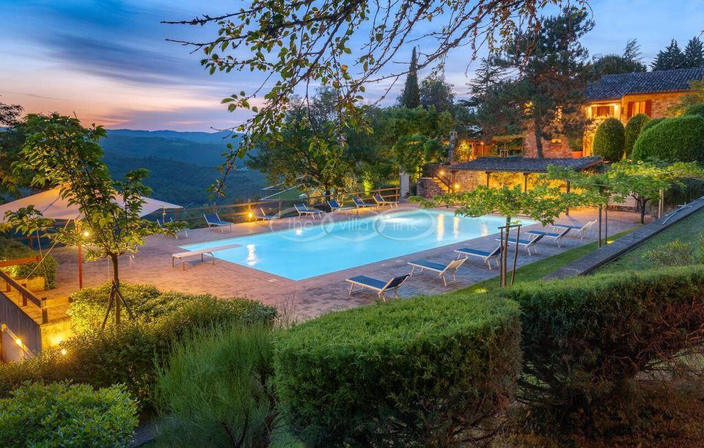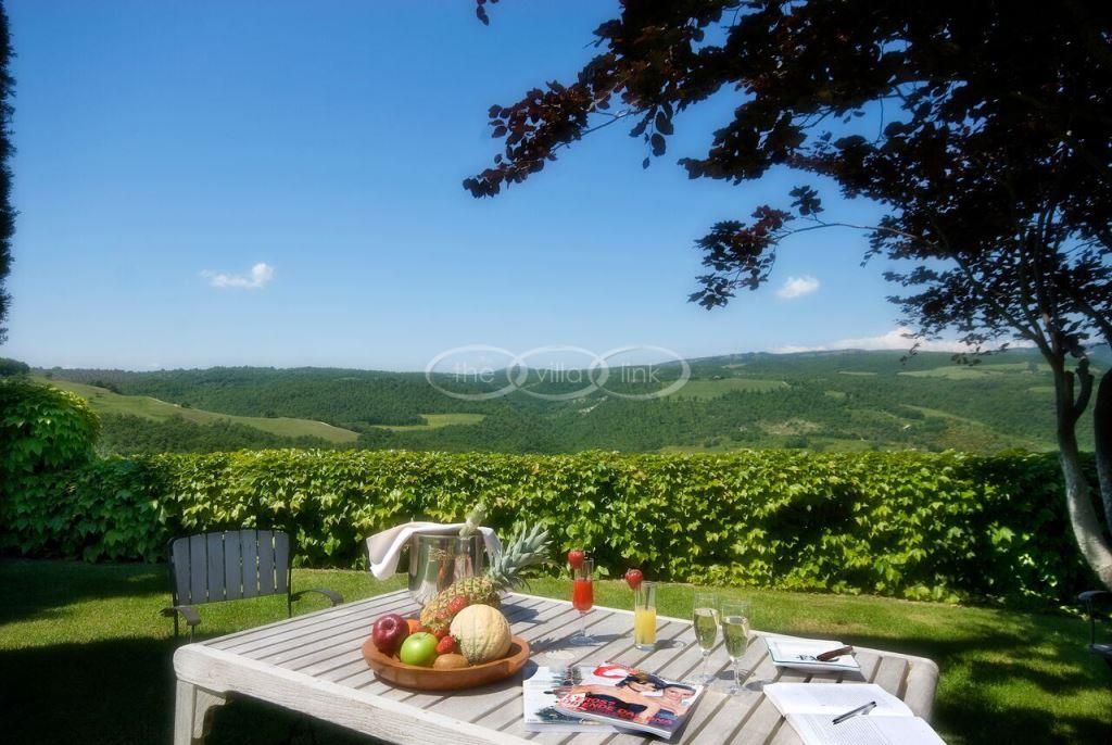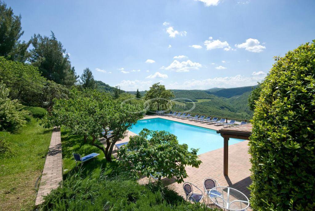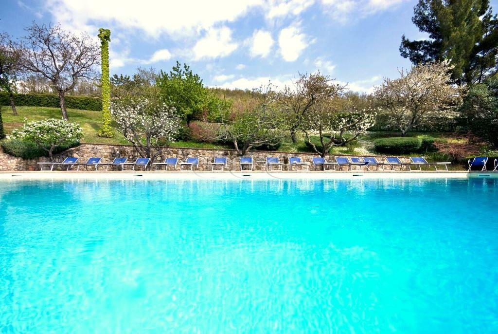 At the end of a cypress avenue protected by the woods, the ‘curtain’ of the Umbrian hills opens, a real postcard image that surrounds this villa, including its guest houses.