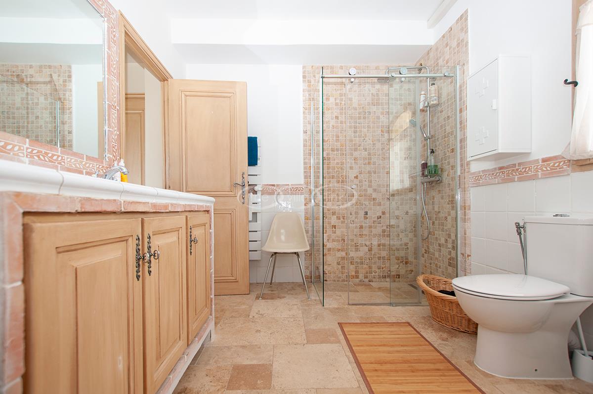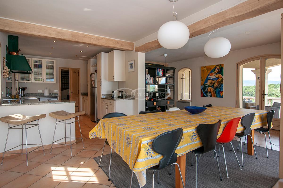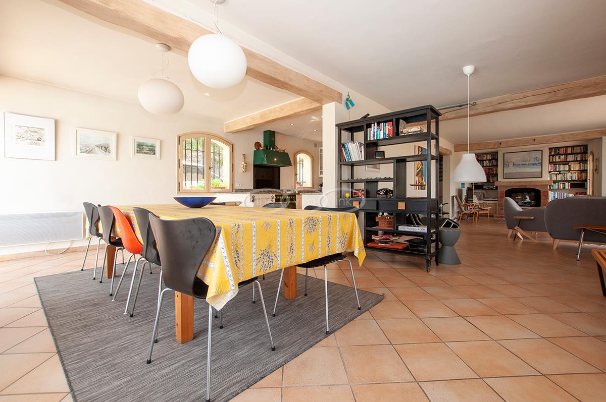 The main floor is open plan between the living area, the seating area as well as the kitchen. You have direct access to the terrace and swimming pool. The master bedroom is located on the main floor and the other three bedrooms are located on the first floor.