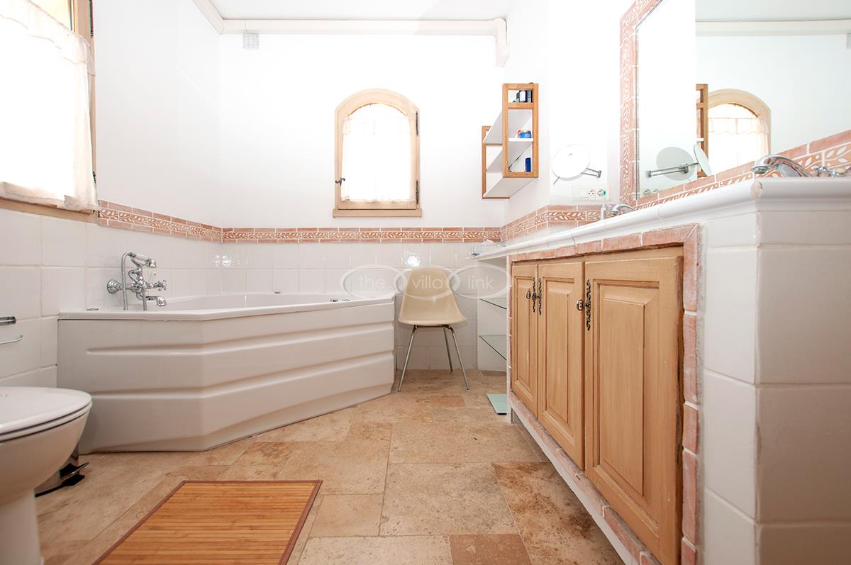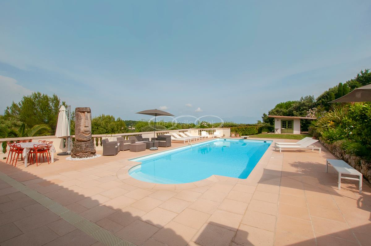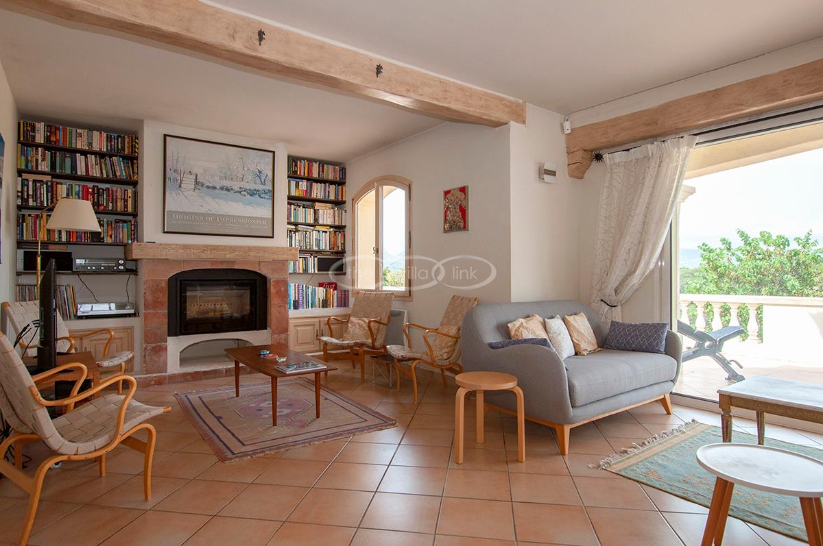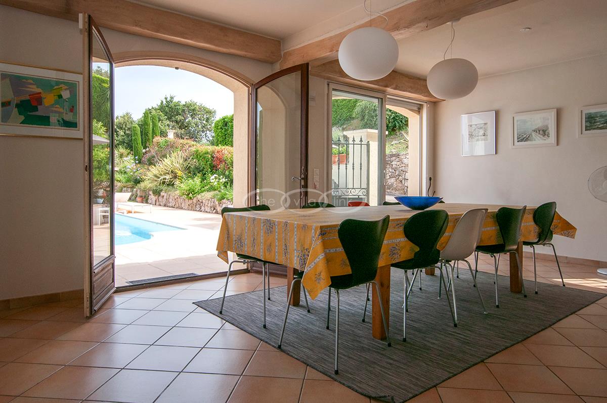 The main floor is open plan between the living area, the seating area as well as the kitchen. You have direct access to the terrace and swimming pool. The master bedroom is located on the main floor and the other three bedrooms are located on the first floor.