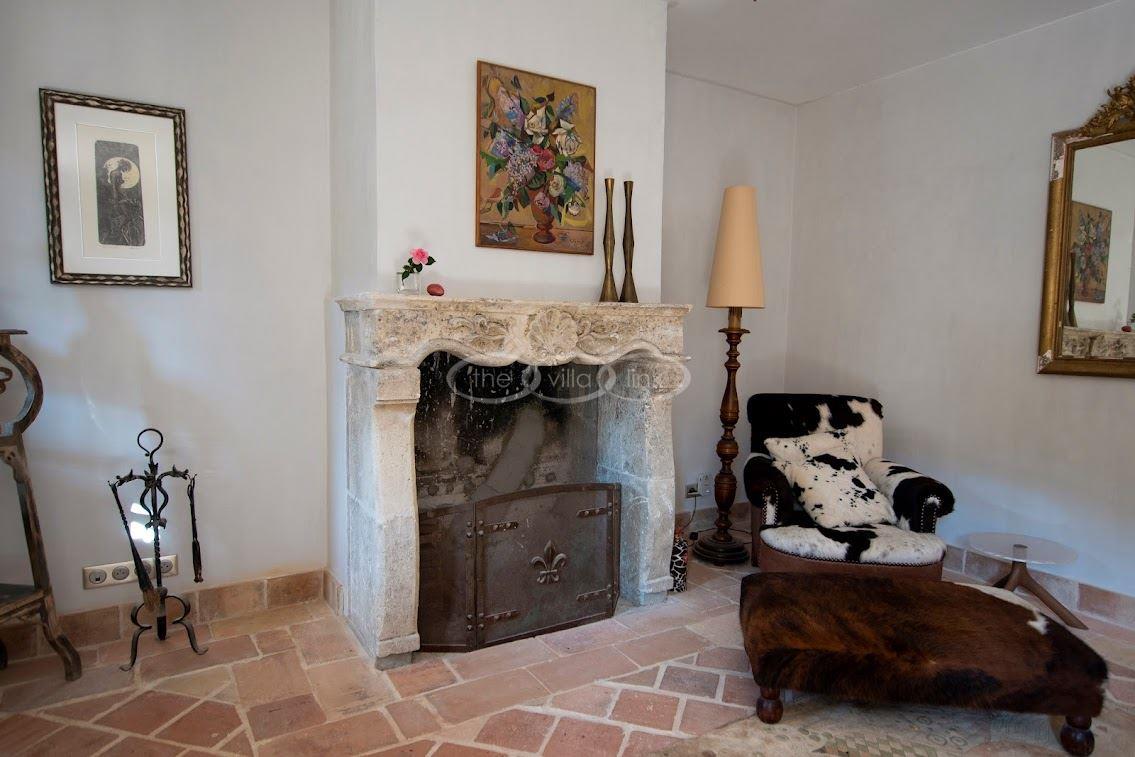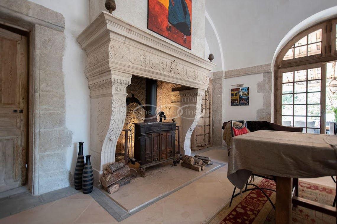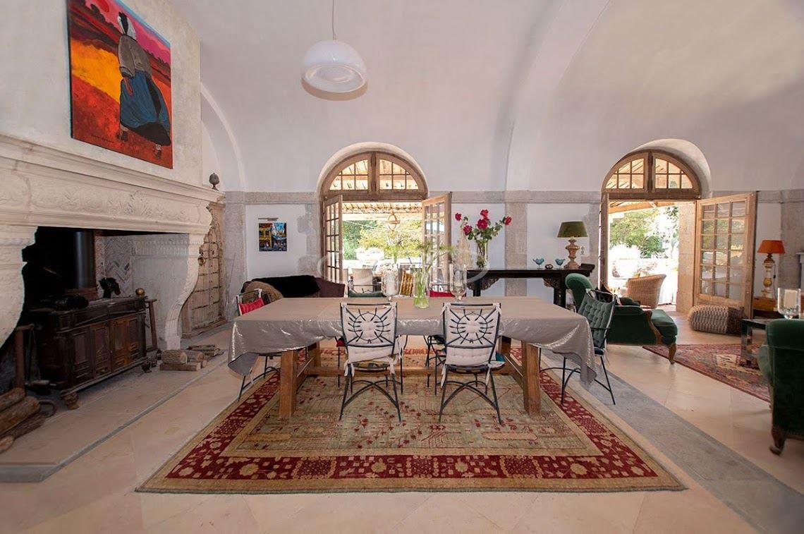 Large and spacious living room with its authentic vaulted ceilings and open fire place.