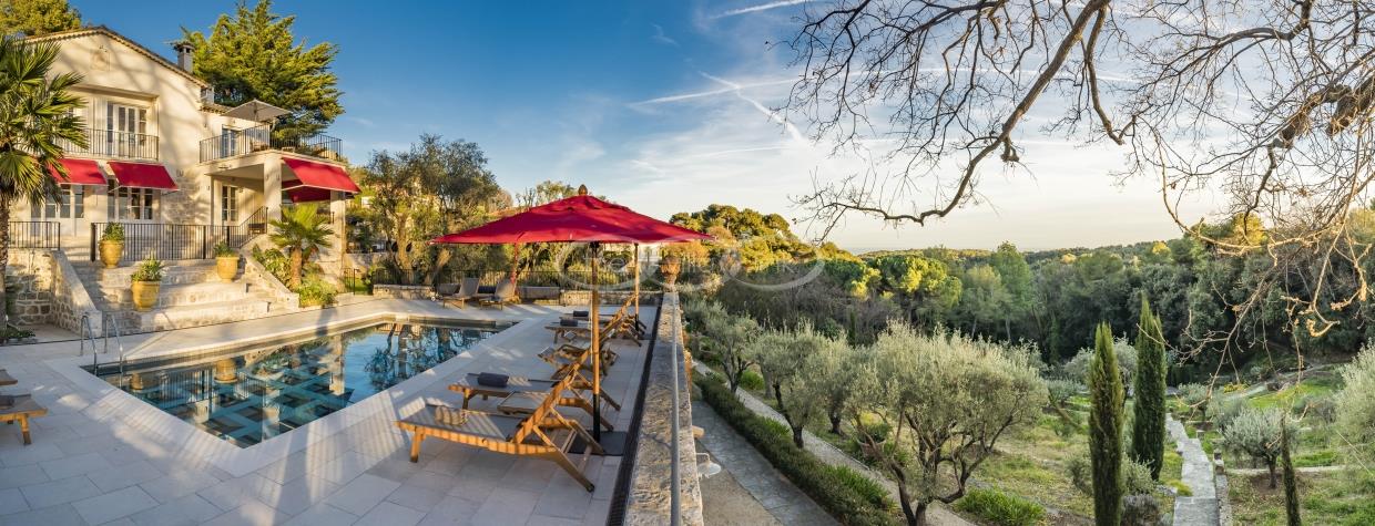 This lovely villa is located only a few minutes' walk from the centre of Vence. Elegantly decorated and the main villa has four bedrooms and the independant studio has another two bedrooms. The grounds are massive (30 000m2) and the lovely pool can be heated off sason.