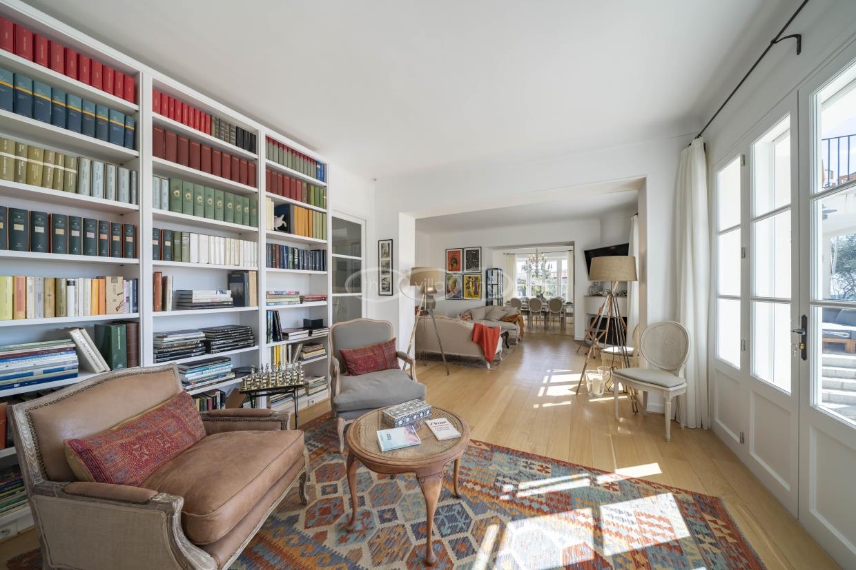 A comfortable living area that is in open plan with the library. You have direct access to the terrace with its outdoor seating and pool area.