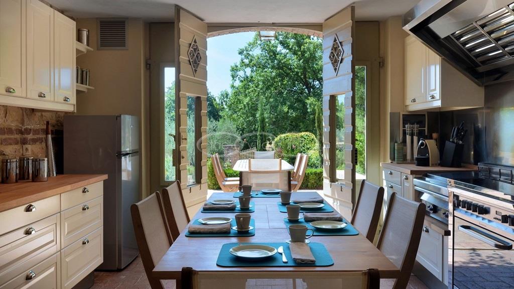 There are five double bedrooms that can be converted into double or twin bedrooms. The villa offers four bathrooms, two with bath tub and shower and two equipped with a shower. In addition to this, there are two kitchens, of which one large kitchen with professional equipment on the ground floor, offering space to dine in and outdoors on the adjoining terrace. The second kitchen, fully equipped is situated on the first floor, it overlooks another dining room and has doors opening to a terrace with view where you could have your breakfast. On both floors you'll find a complete dinnerware. There is a third terrace, overlooking the lighted garden, which adjoins the master bedroom. All terraces, at night, have an amazing view of the most beautiful trees in the garden.