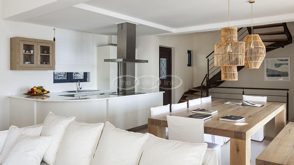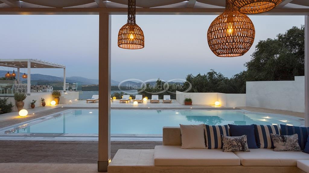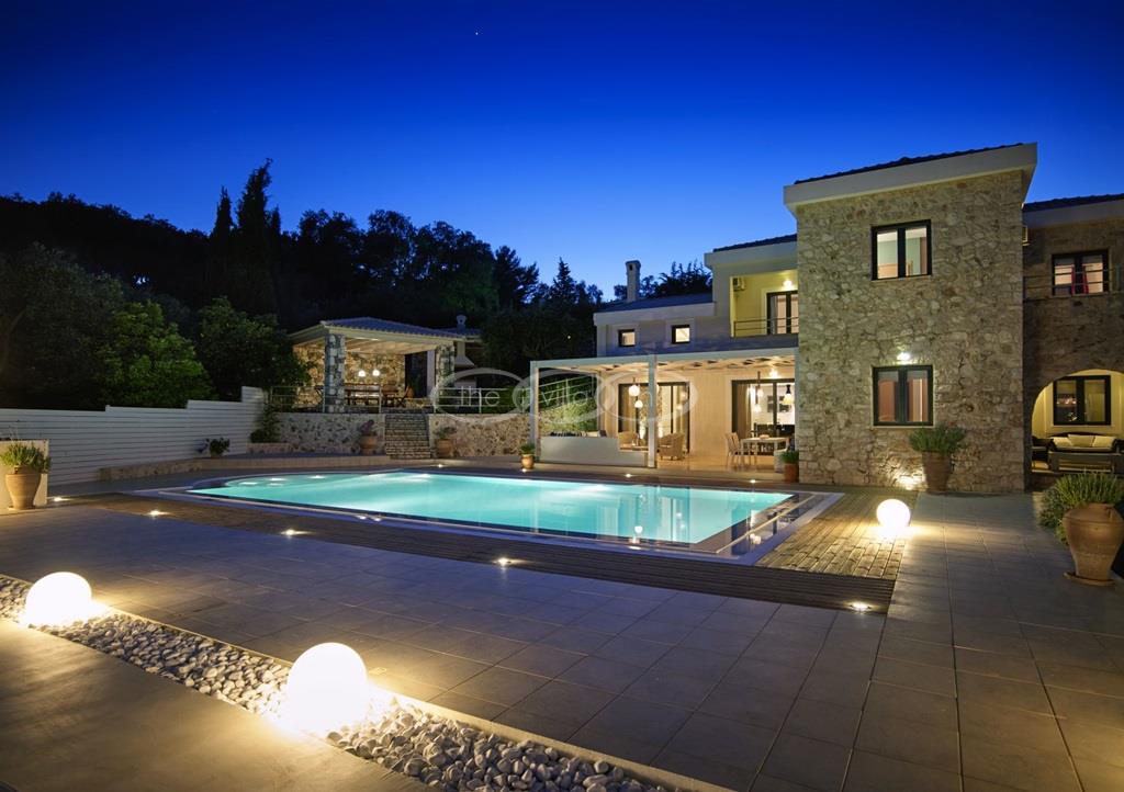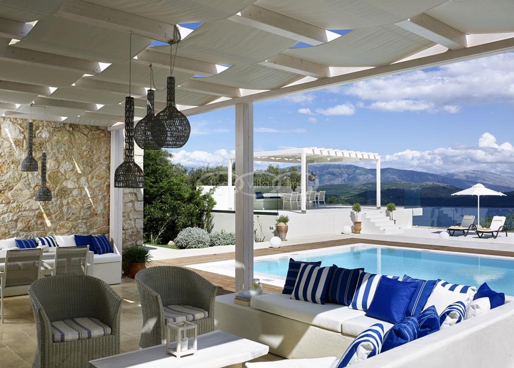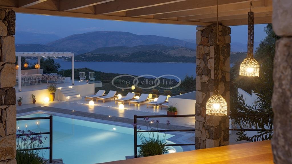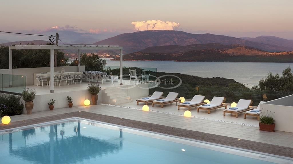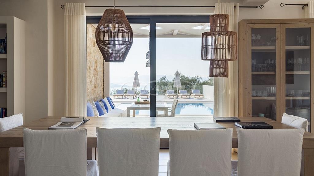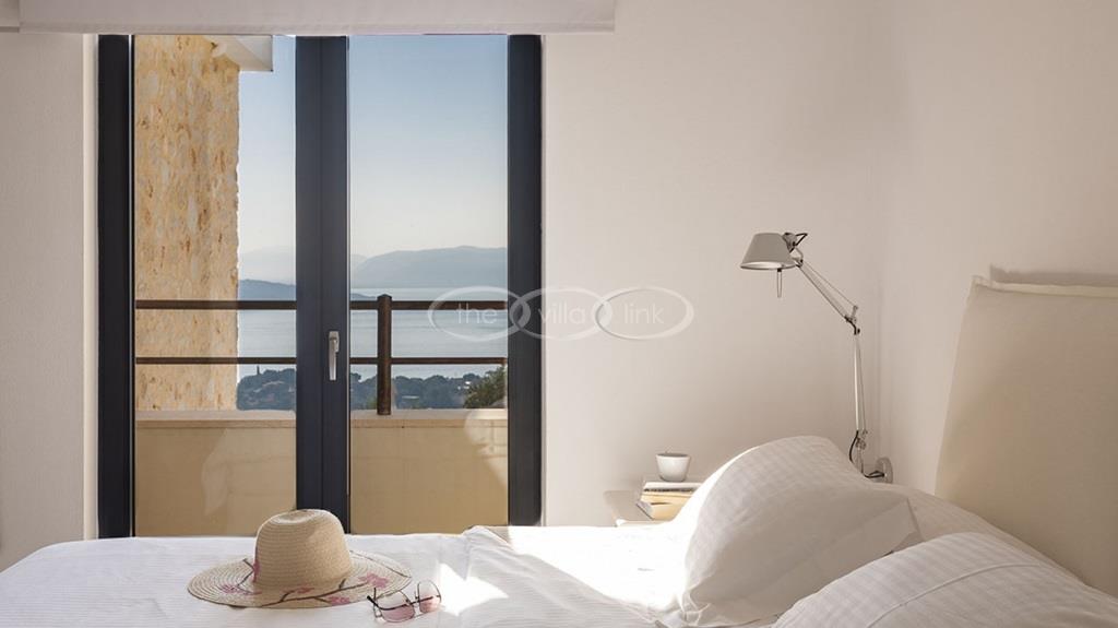 Situated on top of the hillsides of the bay of Agios Stephanos and enjoying stunning views on the Ionian Sea, this new and nicely decorated villa welcomes comfortably up to 8 guests with hotel services and a chef. The main level comprise a large living room with fireplace, dining area and a fully equipped kitchen opening onto the exterior terrace and the sea, one double bedroom wih bath and one twin bedroom with bath. The master bedroom with bath, one double bedroom with bath and one twin bedroom with bath are situated on the upper level. The sixth bedroom and a gym are arranged on the lower level; Nice pool with teak covered terraces arranged with sunbeds and alfresco dining with barbecue facing the sea; Air-conditioning in every bedroom; Short drive to white sand beaches; Complementary services on demand; Possibilities of charter yachts as day charter or combined package; Rental from April to November;