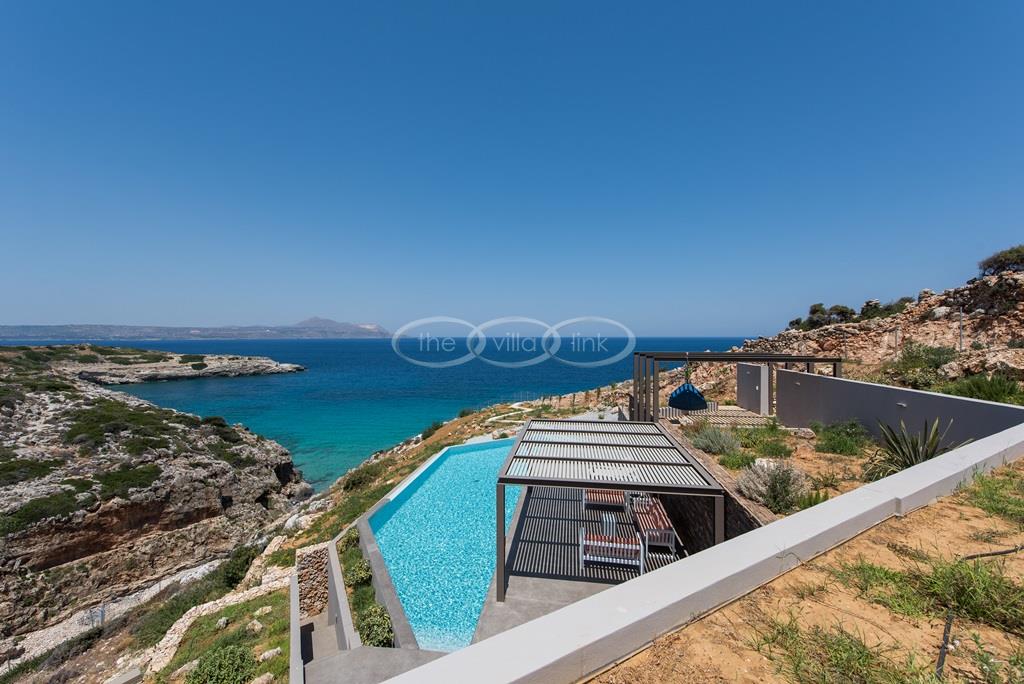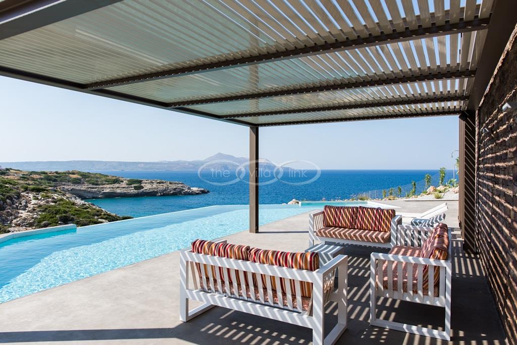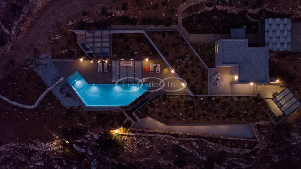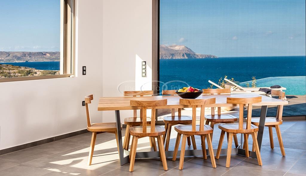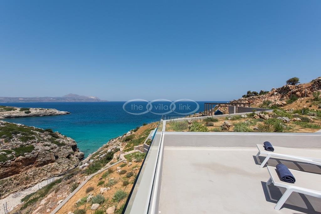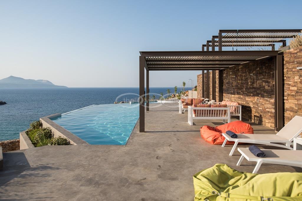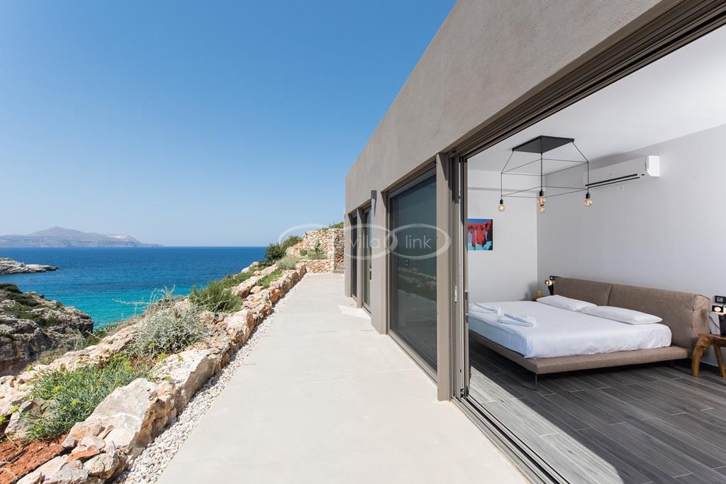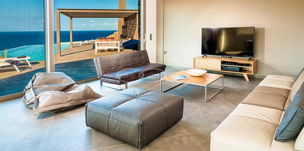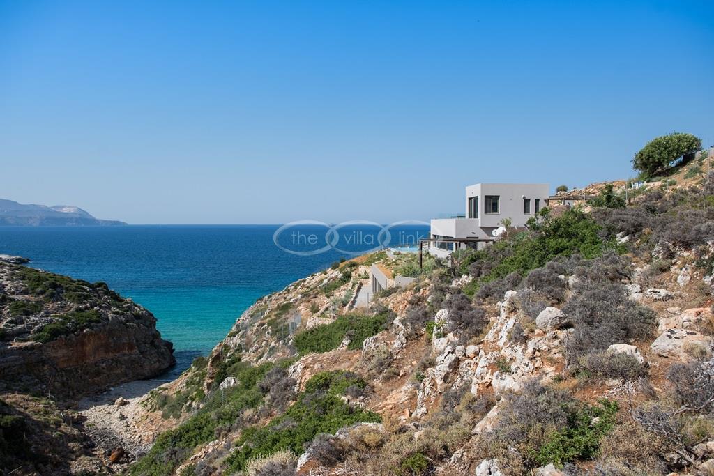 Situated on the west of Creta, 5 minutes drive to Almyrida and 45 minutes to Chania’s airport, this contemporary waterfront villa with infinity swimming pool and breathtaking panoramic sea views welcomes comfortably up to 8 guests. Overlooking a secluded creek that’s only accessible from the villa, with a minimalist style and luxury amenities, the villa on 3 levels distributed by a lift and largely opened onto furnished terraces comprise, on the main level a large living room opening onto the swimming pool with saloon with TV and dining area, a fully equipped modern kitchen and an alfresco dining area with barbecue. On the upper level is set the master bedroom with en-suite bathroom and a large private terrace. On the lower level are situated another master suite and 3 double bedrooms, each with en-suite bathroom, each with en-suite bathroom and access to a terrace, and a TV saloon. Air-conditioning throughout;