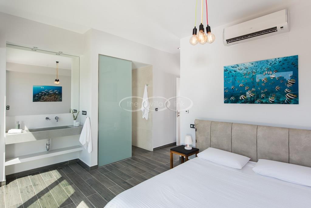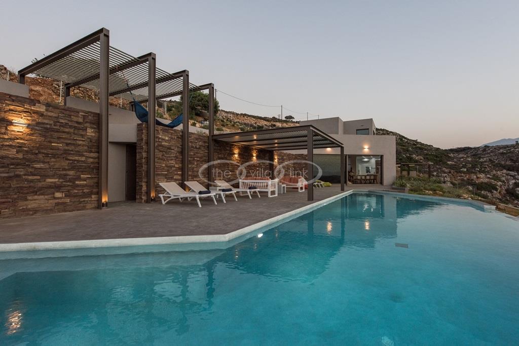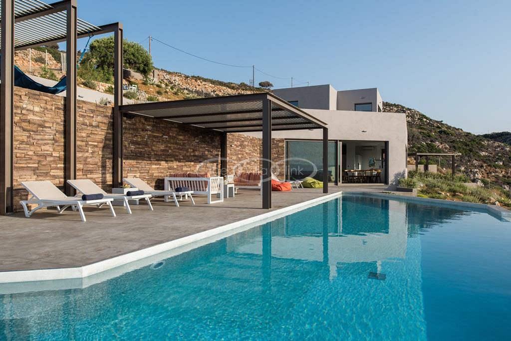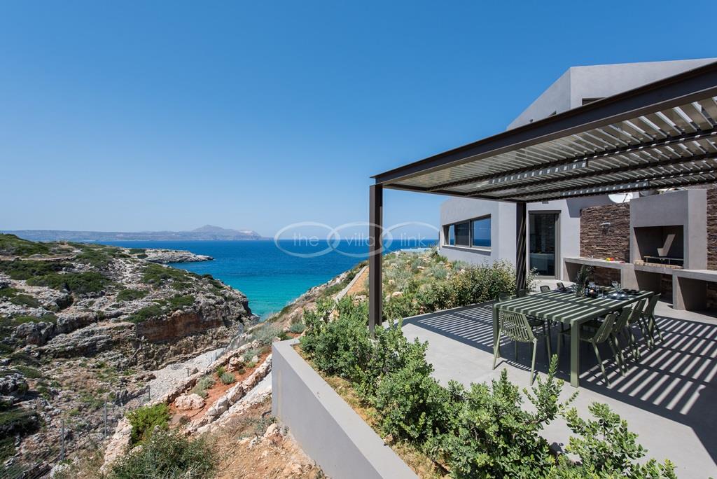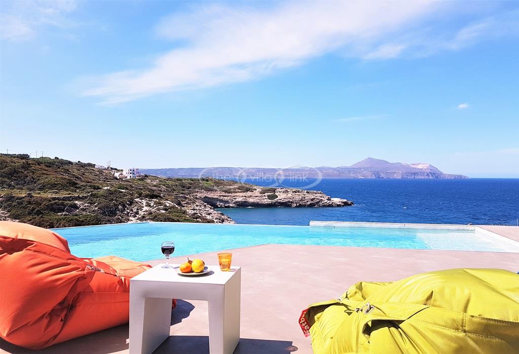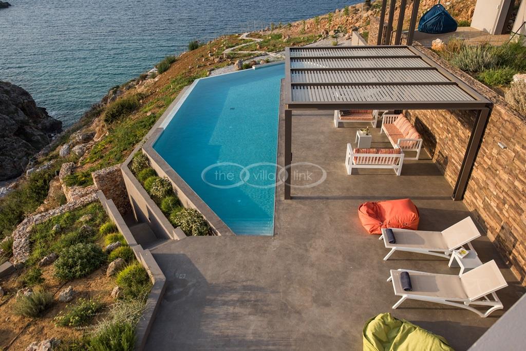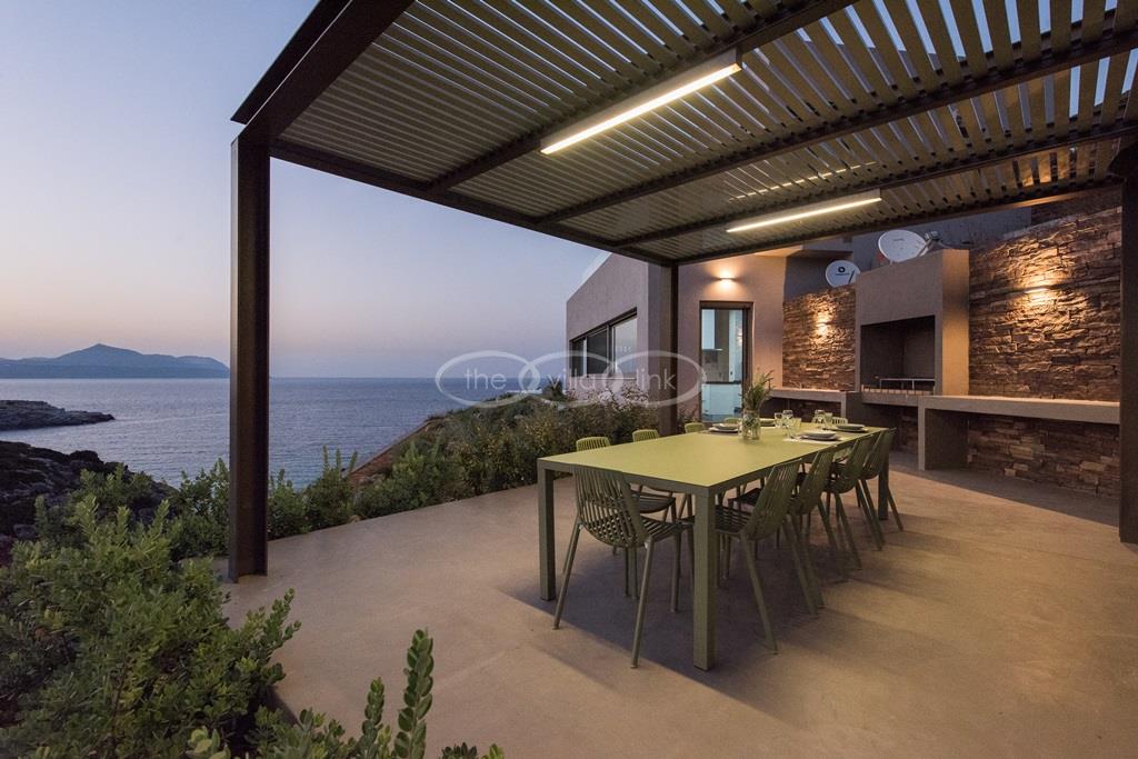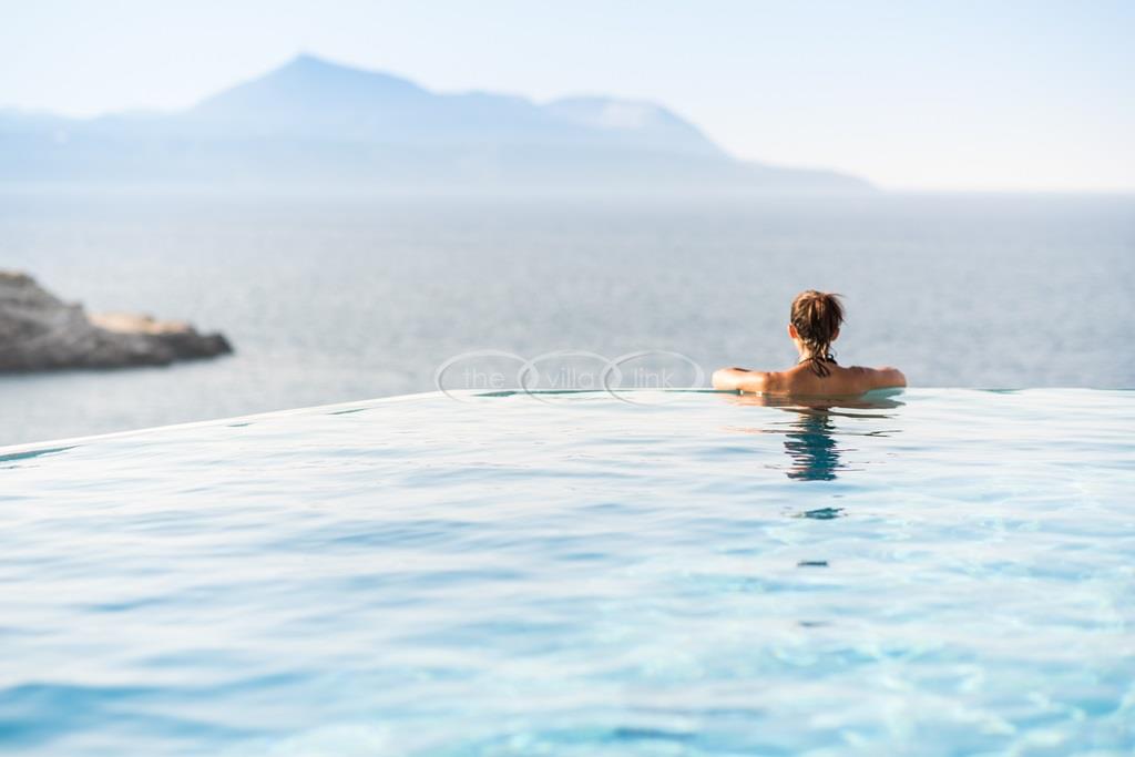 Situated on the west of Creta, 5 minutes drive to Almyrida and 45 minutes to Chania’s airport, this contemporary waterfront villa with infinity swimming pool and breathtaking panoramic sea views welcomes comfortably up to 8 guests. Overlooking a secluded creek that’s only accessible from the villa, with a minimalist style and luxury amenities, the villa on 3 levels distributed by a lift and largely opened onto furnished terraces comprise, on the main level a large living room opening onto the swimming pool with saloon with TV and dining area, a fully equipped modern kitchen and an alfresco dining area with barbecue. On the upper level is set the master bedroom with en-suite bathroom and a large private terrace. On the lower level are situated another master suite and 3 double bedrooms, each with en-suite bathroom, each with en-suite bathroom and access to a terrace, and a TV saloon. Air-conditioning throughout;