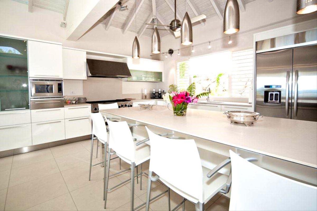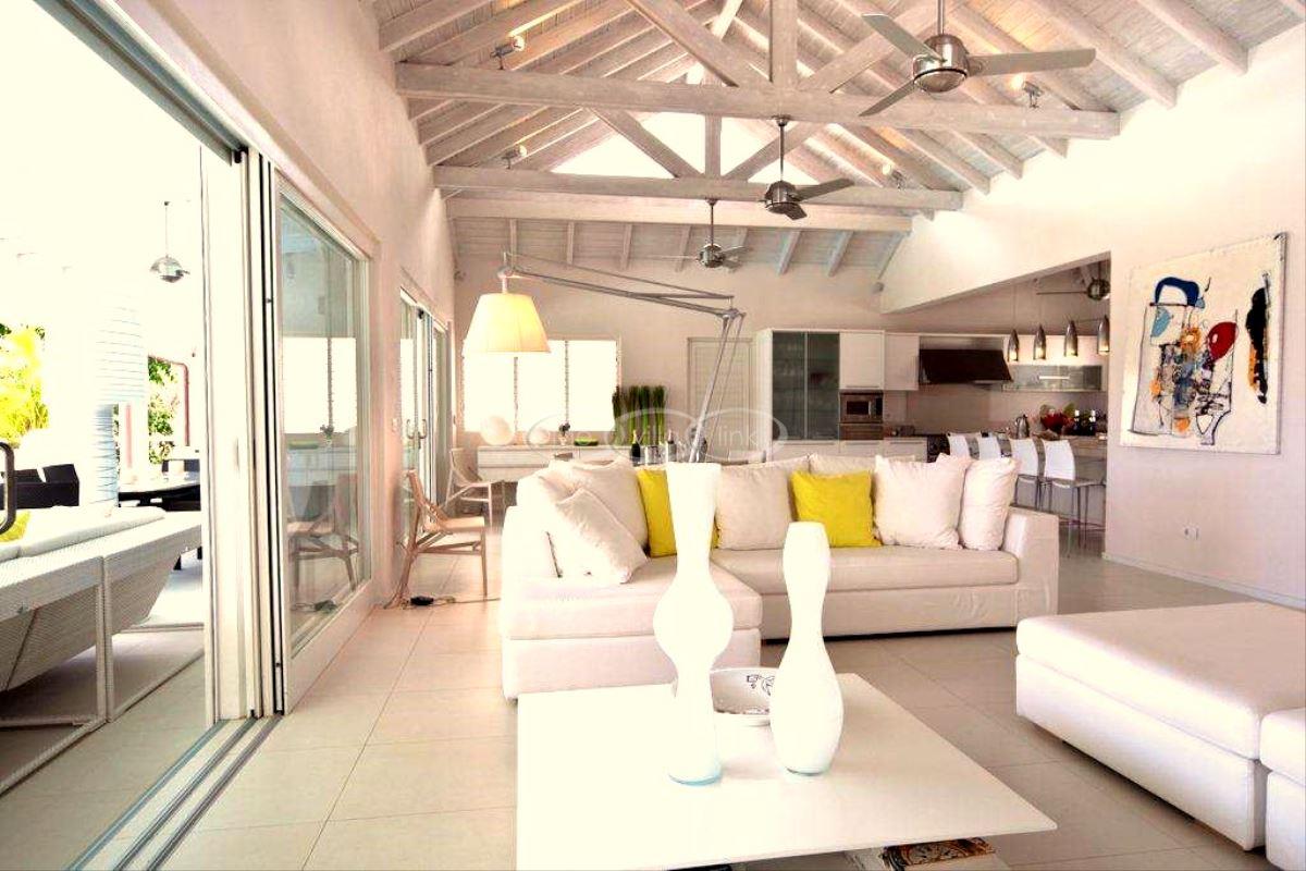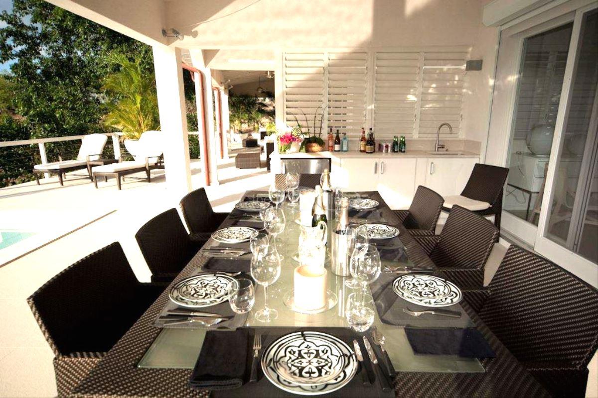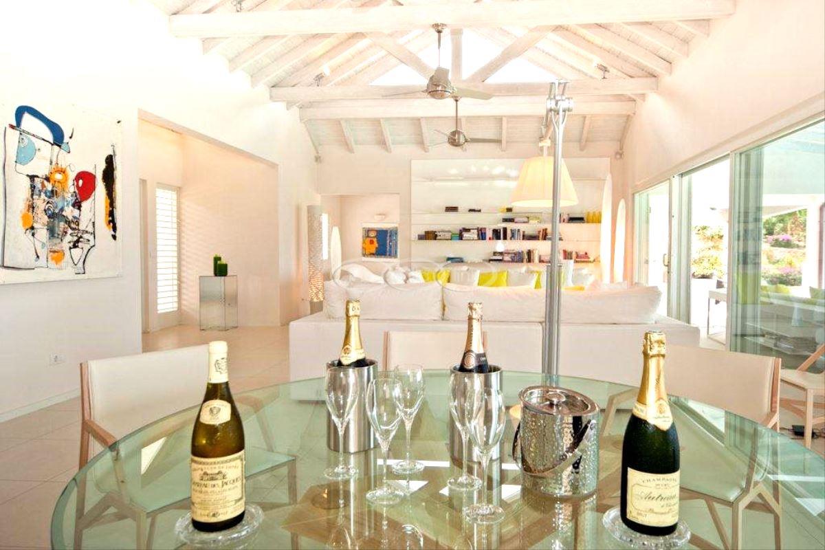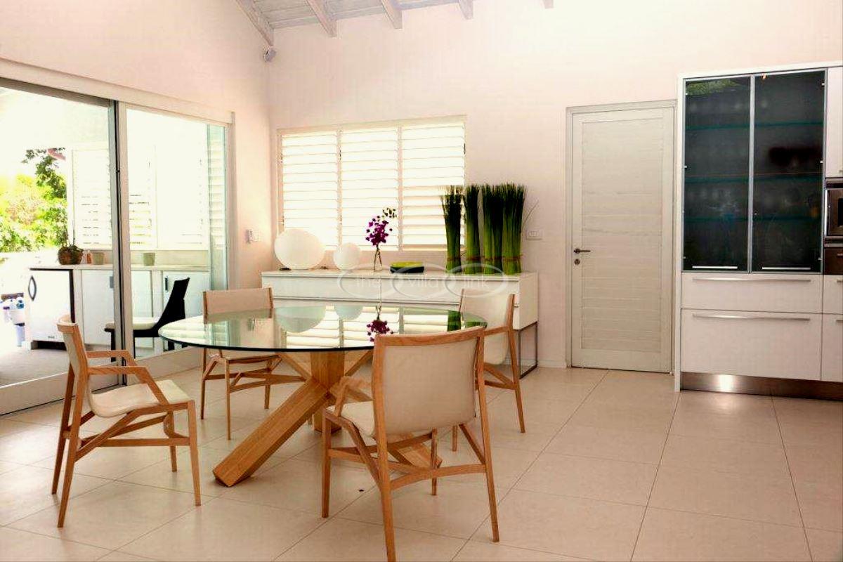 Open plan with the dining area and kitchen. Spacious and modern and offers great views over the pool and sea.