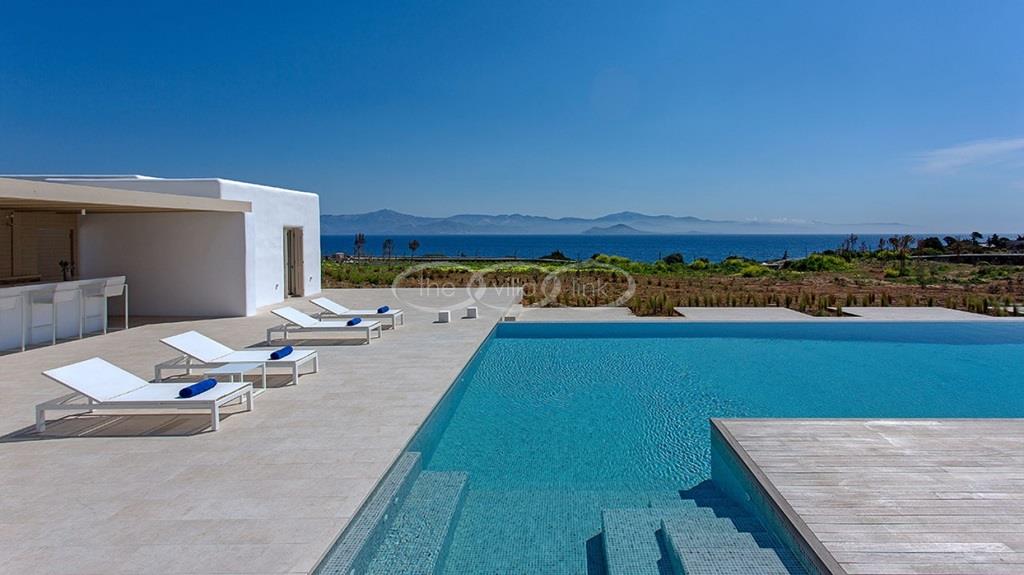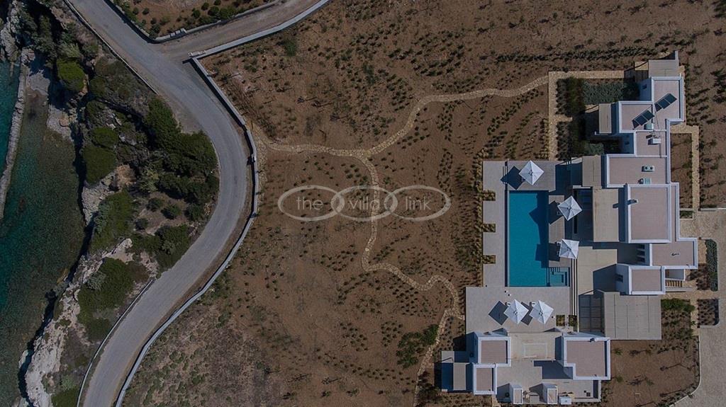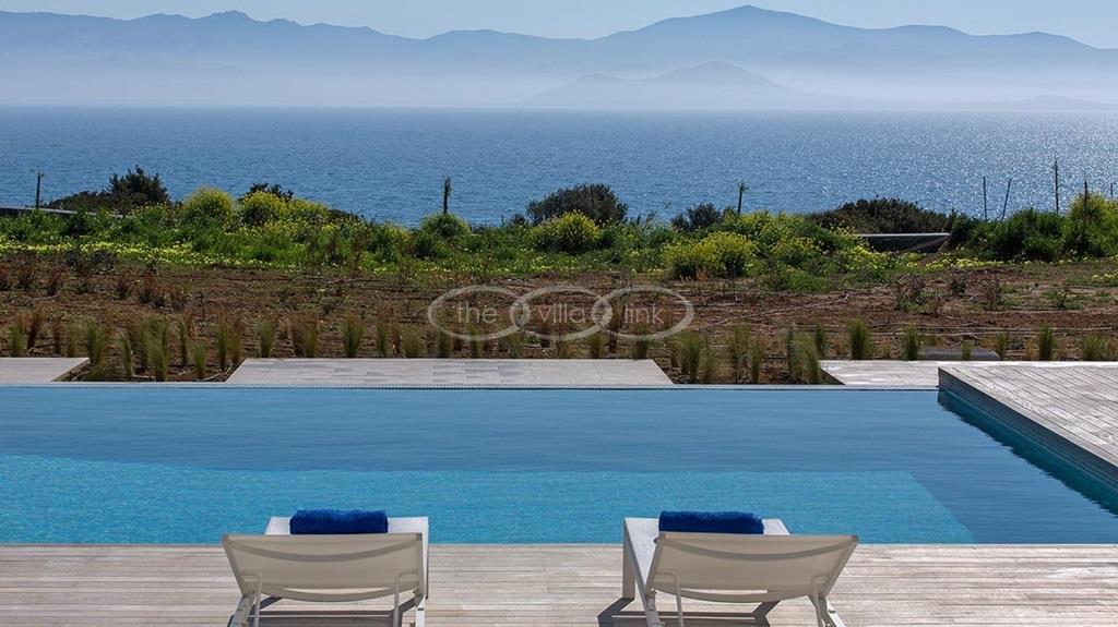 Situated on the first line on the Eastern coast of the island of Paros at the heart of a large enclosed garden, within walking distance to a small cove and a few minutes’ drive to Naoussa, this luxury and spacious contemporary villa with panoramic sea views welcomes comfortably up to 14 guests. Outside, the villa features patios and terraces with comfortable sofa beds and sunbeds, a 17x7m swimming pool, as well as magnificent outdoor dining and sitting area. With a contemporary decoration, it is composed of a main villa comprising a living room with saloon with TV and fireplace and dining area, an independent fully equipped modern kitchen, the master suite with dressing and bathroom with steam shower and 2 double bedrooms, each with en-suite bathroom with shower. On the lower level are arranged a saloon with opened kitchen, a gym, two double bedrooms with independent access and en-suite bathroom with shower and one twin bedroom with en-suite bathroom with shower that is more adapted for staff. A guest house next to the pool comprises a double or twin bedroom with bathroom. Air-conditioning throughout; Indoor-Outdoor Sonos music system; Live-in staff in independent amenities.