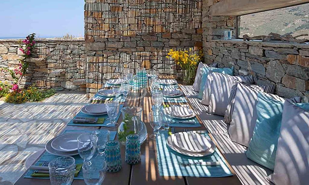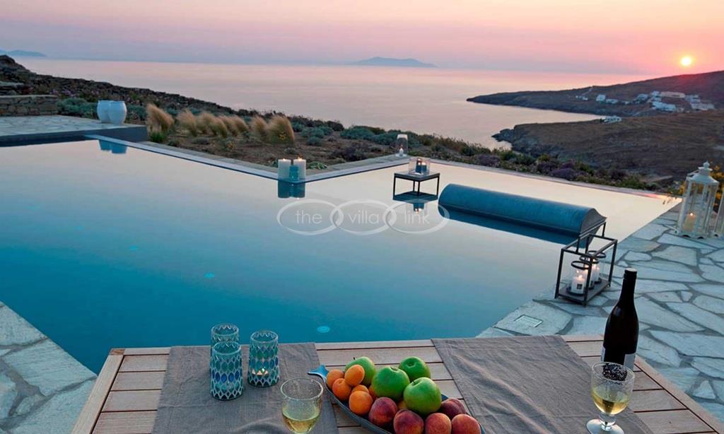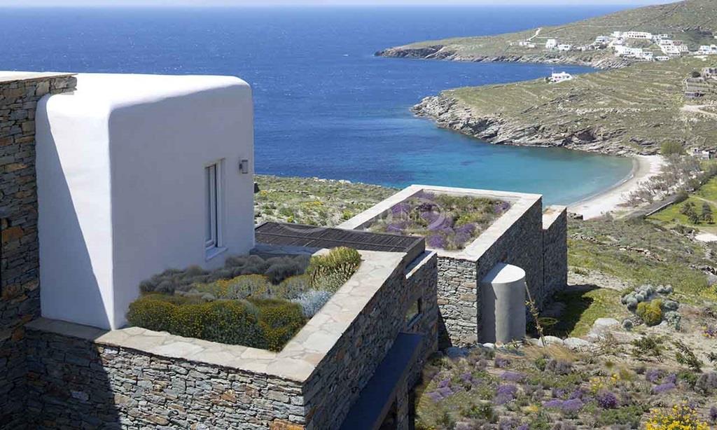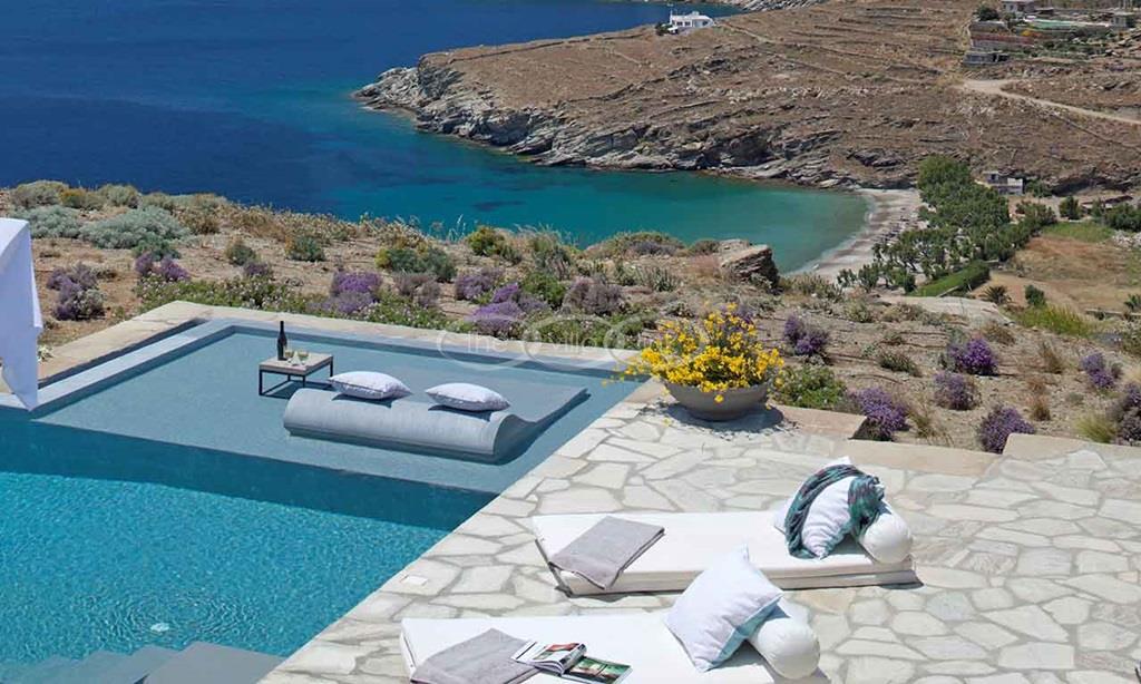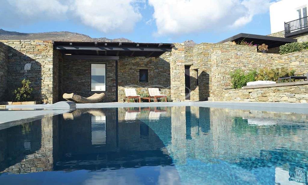 On the Southern cost of the island of Tinos, in a private domain with beach within walking distance, this seafront with swimming pool welcomes comfortably up to 11 guests. With a contemporary interior style, it is composed of a main villa with, on the main level, a living room with saloon and dining area and a fully equipped modern kitchen, and, on the upper level, the master suite with private terrace and bathroom and one twin bedroom and one bedroom with 2 bunk beds and a single bed sharing one bathroom. The guests house comprise one double and one twin bedroom sharing a bathroom ; Ceiling fans in the bedrooms; Luxury service level and personnel on demand; Rental all year long;