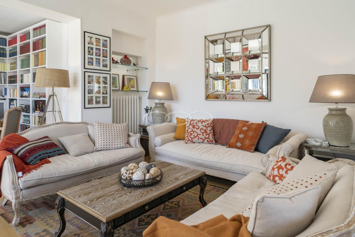 A comfortable living area that is in open plan with the library. You have direct access to the terrace with its outdoor seating and pool area.